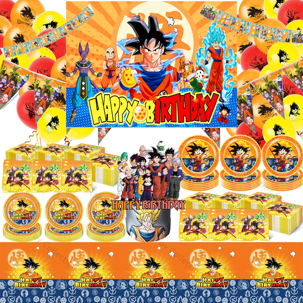 Conjunto de suprimentos para festa temática de Dragon Ball Anime Goku Meninos Homem Decoração de bolo de aniversário Banner Conjuntos de placa de copo Folha inflável de látex