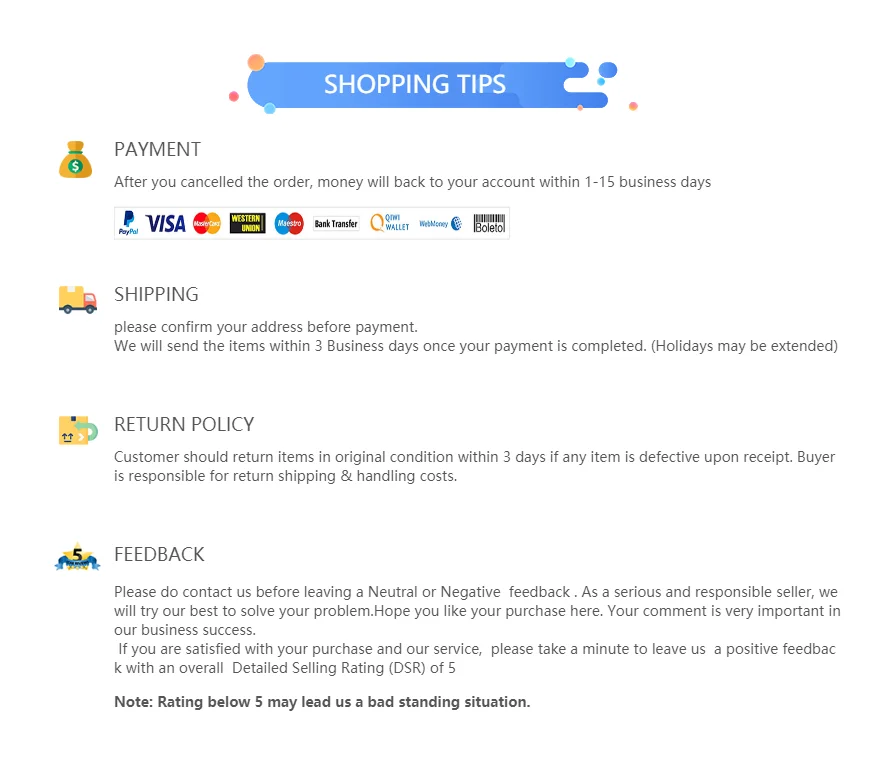 3. Devido ao transporte longo, o item pode danificar em trânsito, se o dano do item, Pls entre em contato conosco em primeiro lugar imediatamente antes de deixar feedback, obrigado pela sua compreensão.
