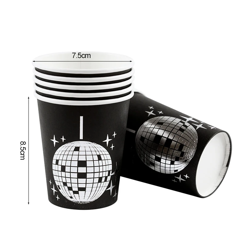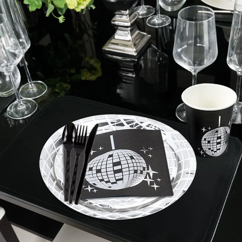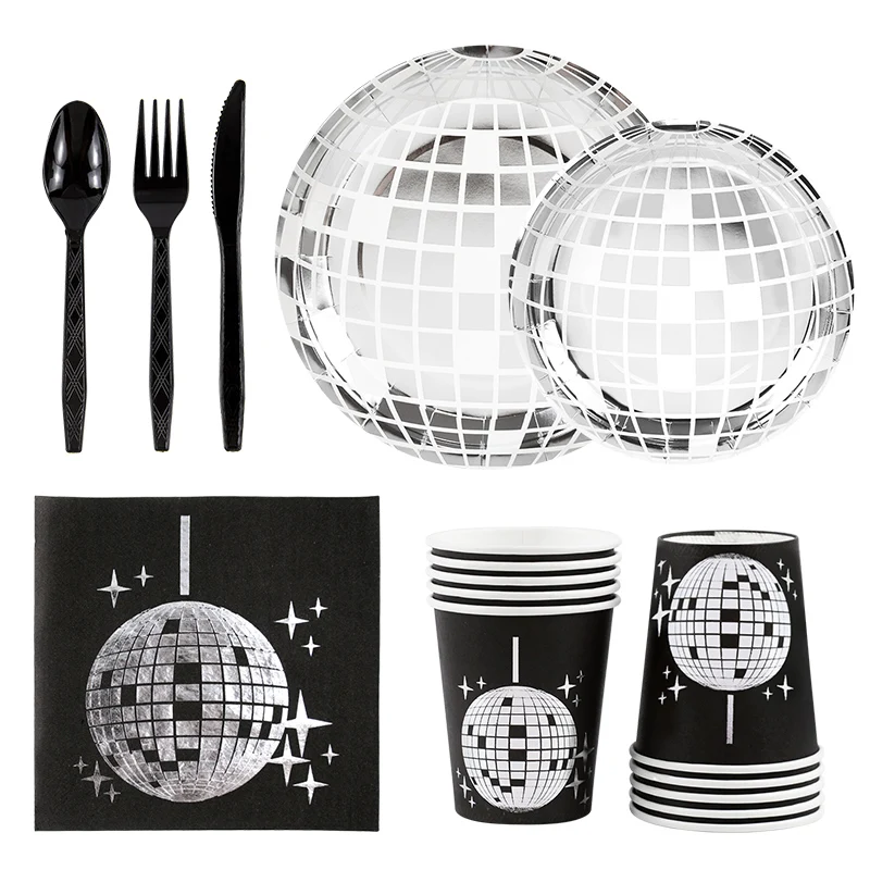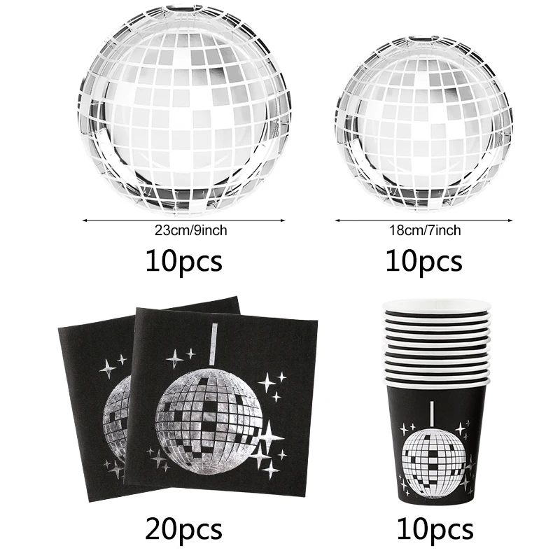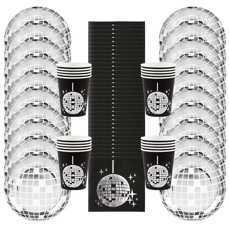 Conjunto de utensílios de mesa descartáveis para festa temática de discoteca, prata, bola de discoteca, guardanapos, copos, decoração de festa de aniversário dos anos 70, suprimentos de casamento