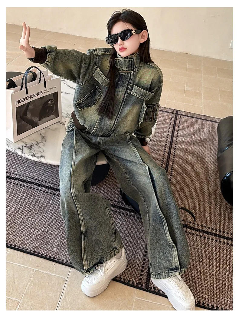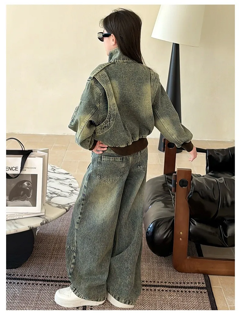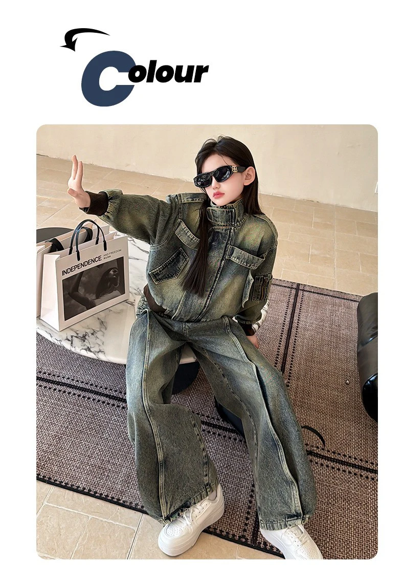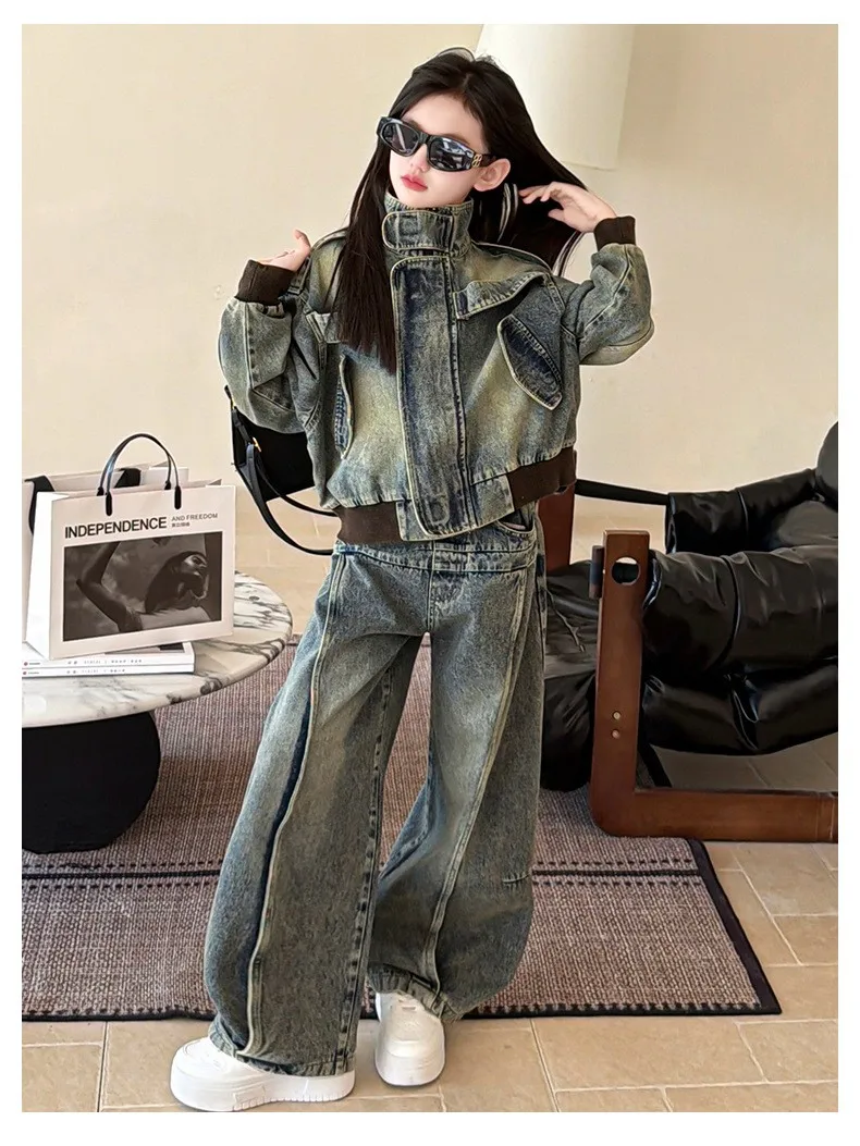 Conjunto jeans retrô americano para meninas, primavera 2026, novo estilo, casaco com gola abotoada e calças até o chão Set5-13Y