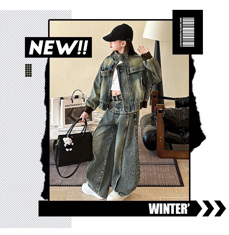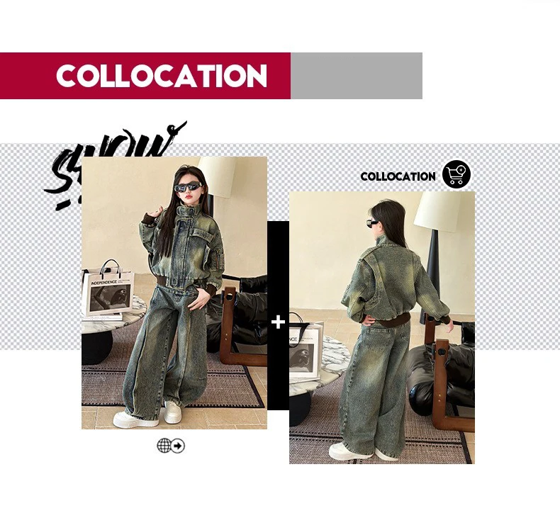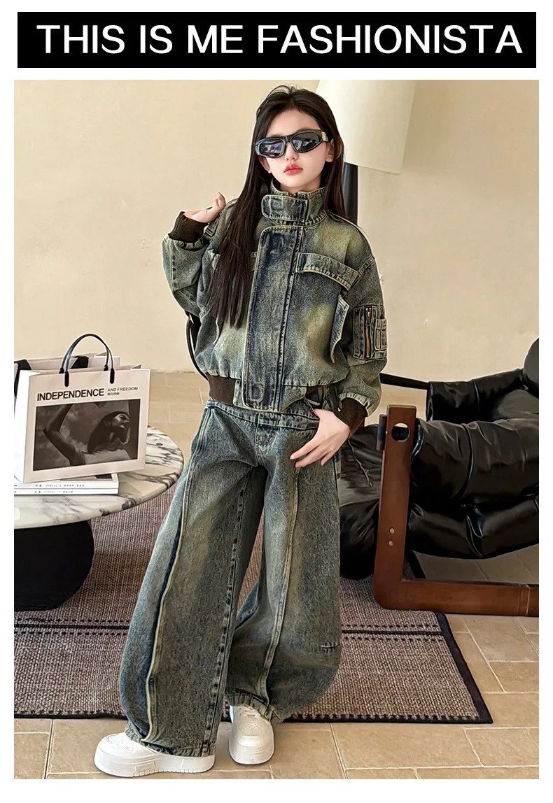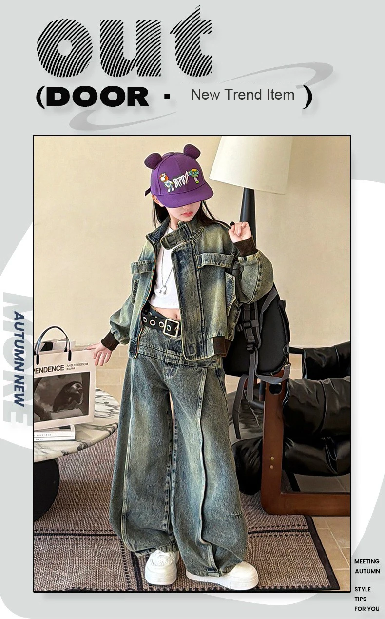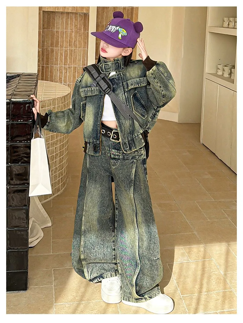Conjunto jeans retrô americano para meninas, primavera 2026, novo estilo, casaco com gola abotoada e calças até o chão Set5-13Y