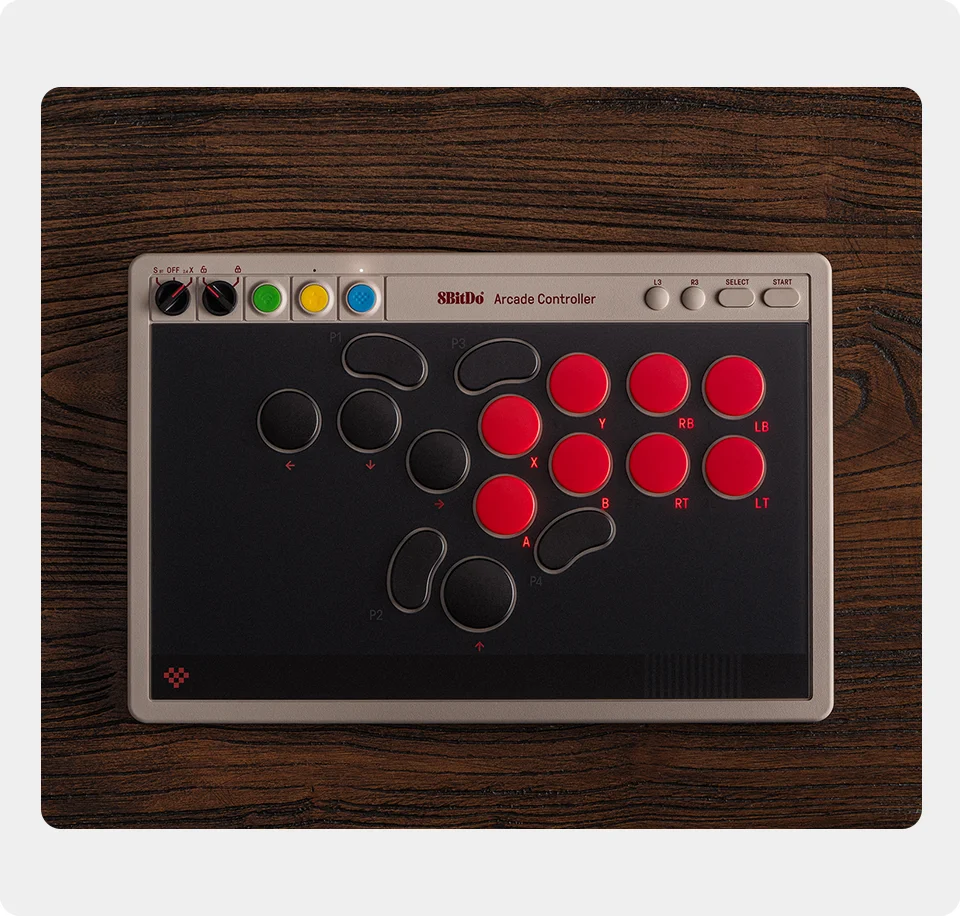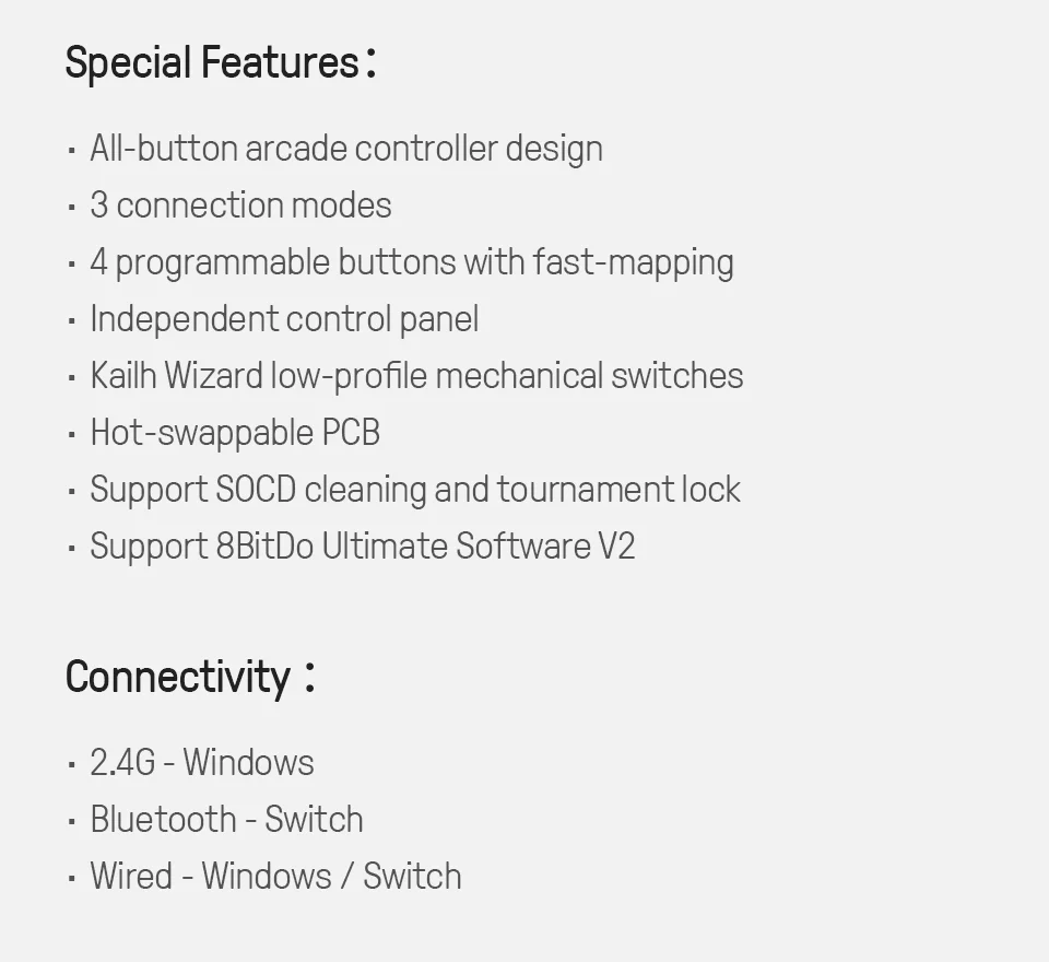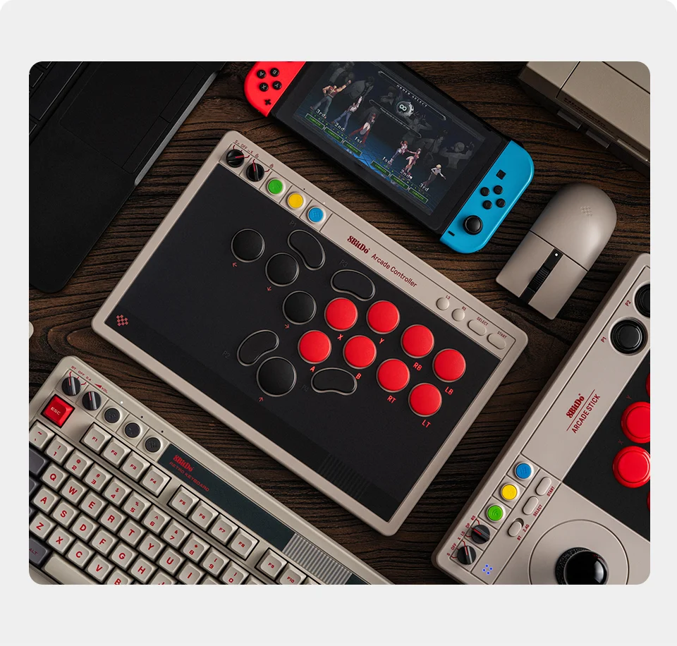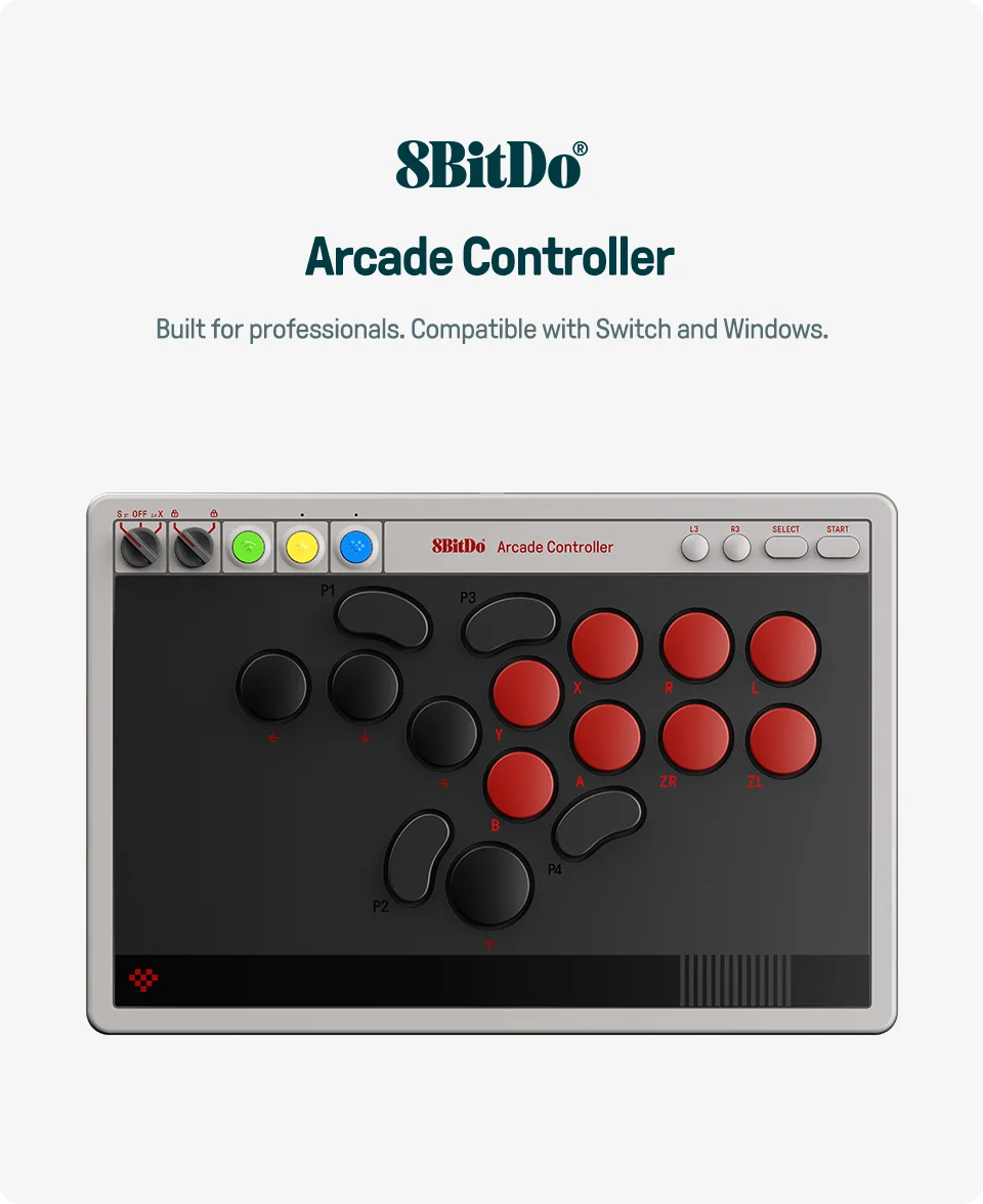 - > Controlador de arcade sem fio com todos os botões 8BitDo para Switch 1/2 e Windows, interruptores mecânicos de baixo perfil, 4 botões programáveis