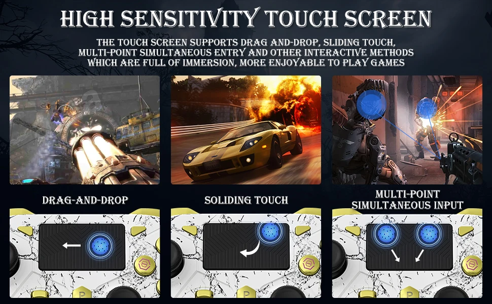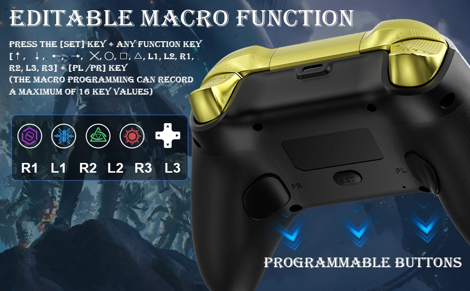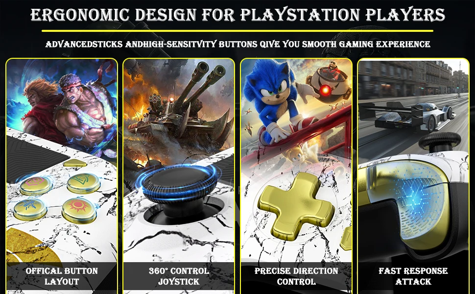 Projetado especificamente compatível com consoles PS4/Slim/pro, com o mais recente sensor de movimento de 6 eixos e tecnologia de vibração, e foi melhorado e atualizado com base no feedback do cliente para resolver problemas como baixa sensibilidade, atrasos de teclas e joystick e Bluetooth instável- conexões compatíveis.