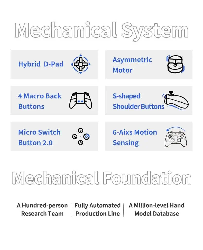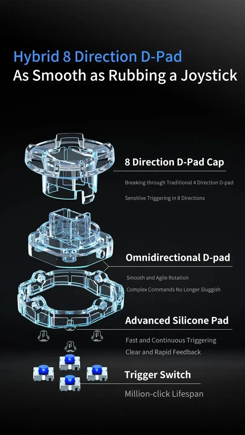 8.Eixo giratório D-pad 2.0: Evita pressionamentos errados de botões durante movimentos combinados e é mais confortável para longas sessões de jogo.Motor assimétrico de parada rápida.Oferece rico feedback de vibração para imersão contínua.