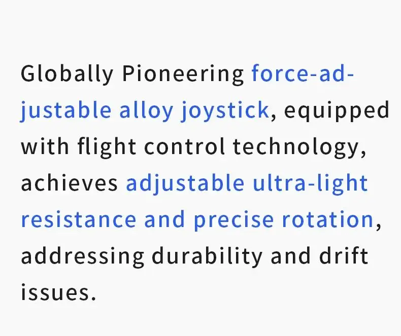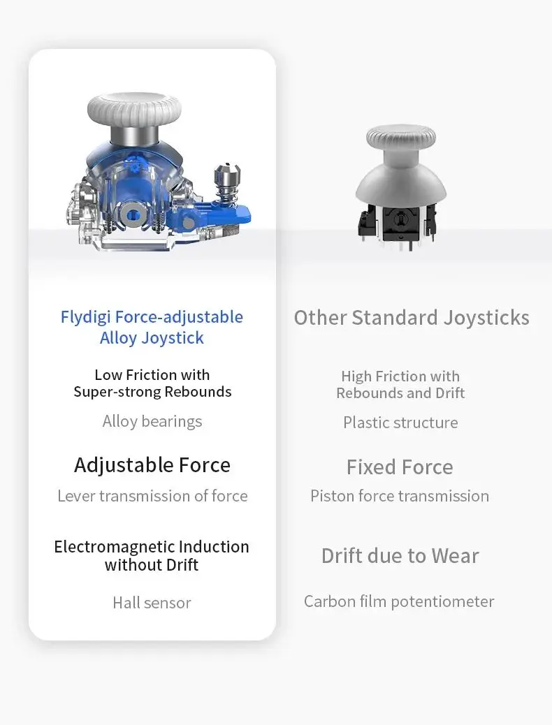 Possui uma faixa de ajuste de força ultra ampla de 30 a 100gf.Possui forte centralização, sem desvio após longo uso, partida e impulso suaves e uma latência ultrabaixa de 0,003s.Como uma tecnologia patenteada mundialmente da Flydigi, ele adota de forma inovadora uma transmissão de força de alavanca autodesenvolvida + estrutura de rolamento de liga para obter força de joystick ajustável e forte centralização.A versão 2.0 melhora muito o desempenho do chip de controle principal e melhora a resistência do material do joystick.Comparado com os joysticks ajustáveis de amortecimento do mercado, possui uma faixa de ajuste mais ampla, centralização mais forte sem desvio, partida e empurrão mais suaves e menor latência.