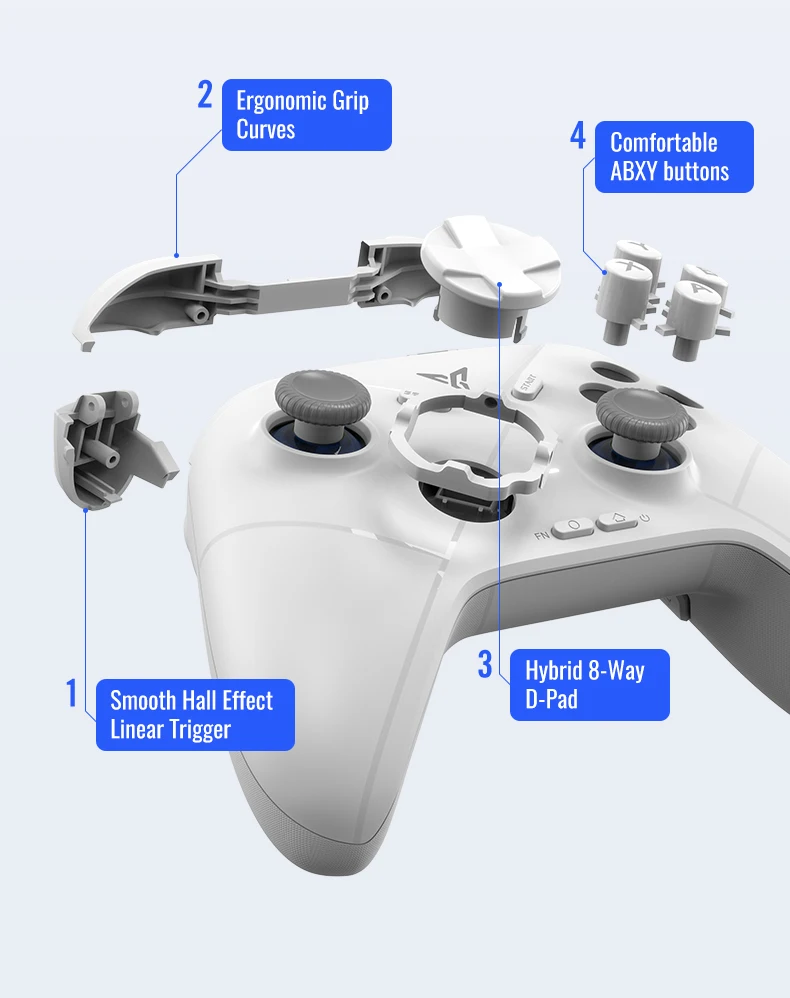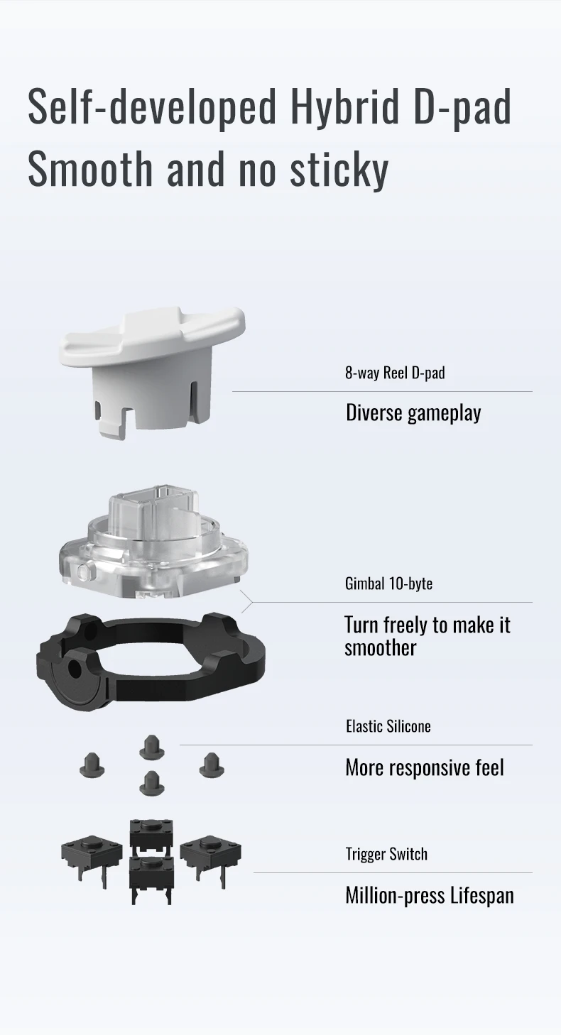 D-pad híbrido autodesenvolvido Flydigi: Equipado com D-Pad híbrido autodesenvolvido Flydigi, ponto sensível em 8 direções, percepção precisa de feedback do polegar, permitindo que jogadores de luta controlem facilmente várias tabelas de comandos.
