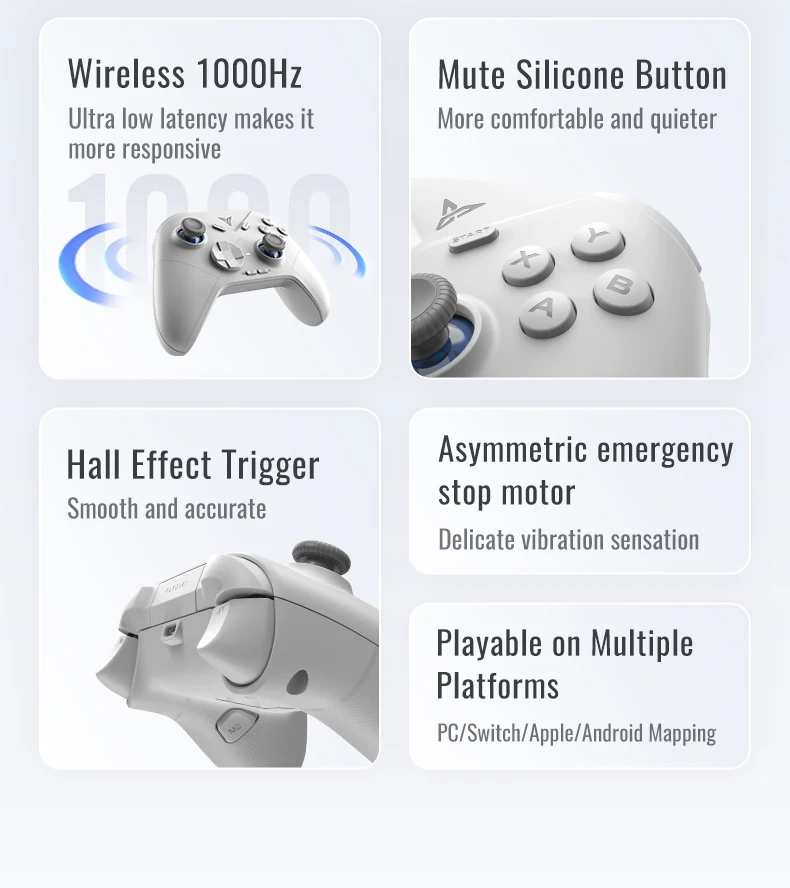 Vibração dupla e controle de ajuste fino: motor vibratório assimétrico com vários níveis de velocidade aumenta a imersão nos jogos.Os botões lineares do gatilho podem fornecer desempenho em vários estágios.Sozinho com o balancim ALPS japonês com anel de metal e combinação de folha POM para uma experiência de jogo mais realista em tempo real, zero deadzone.