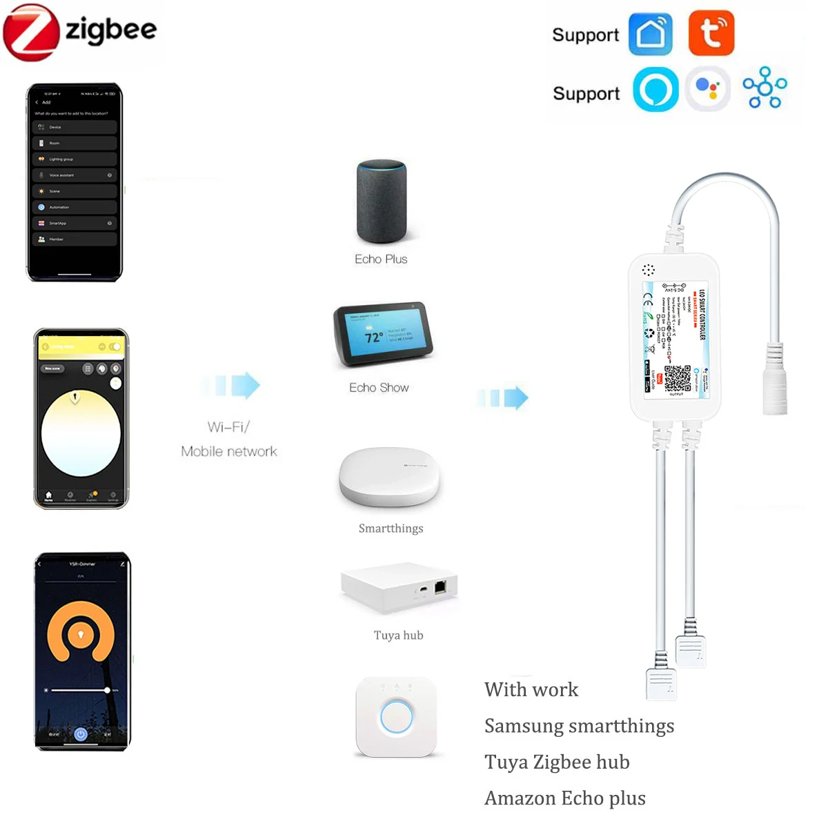 Zigbee controllers work with many gateways like Amazon ECHO Plus hub, O*sr*am,SmartThings, etc