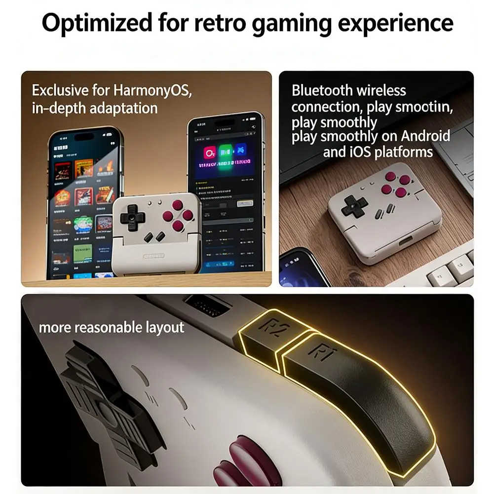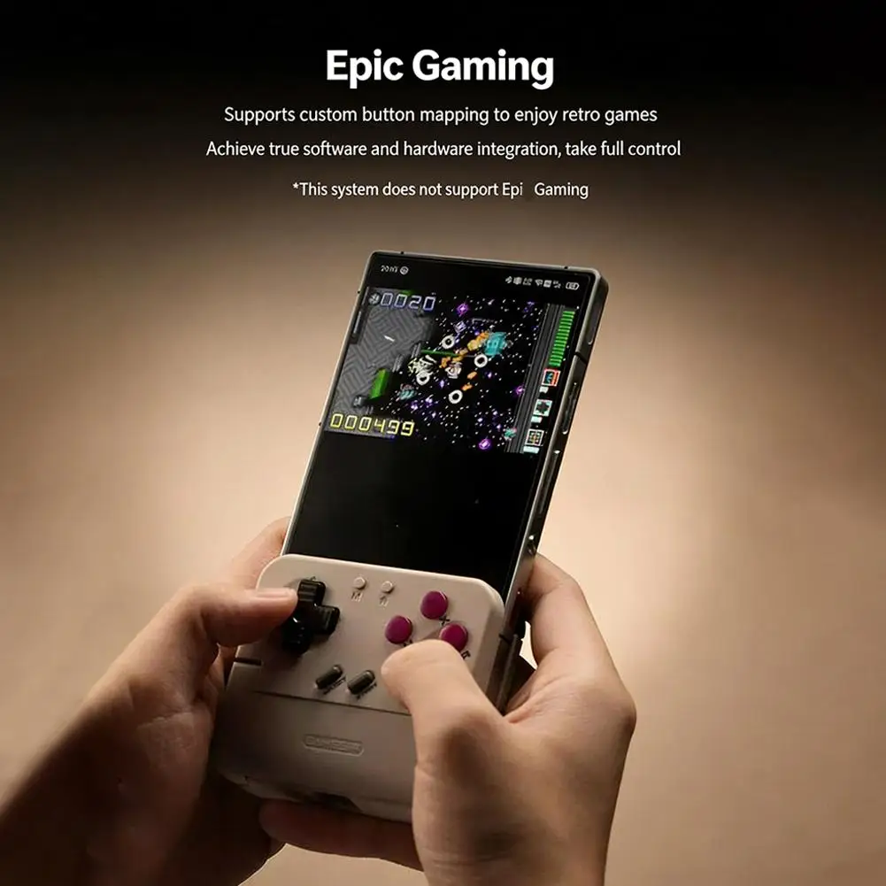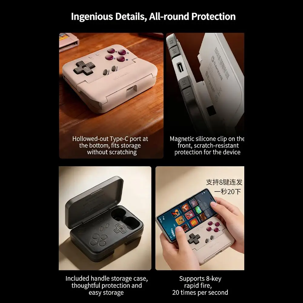 5.**Ecossistema de Jogos Aprimorado e Proteção de Dispositivos**: Acesse uma rica biblioteca de jogos clássicos e contemporâneos com suporte total para aplicativos dedicados como "Gai Shi Zhang You" e "Xiaoji Game World", permitindo atualizações de firmware contínuas e compatibilidade de jogos mais ampla.O controle possui almofadas protetoras de silicone estrategicamente posicionadas na frente e atrás, proporcionando uma fixação segura e sem arranhões para o seu smartphone e garantindo uma conexão estável durante suas aventuras de jogo.