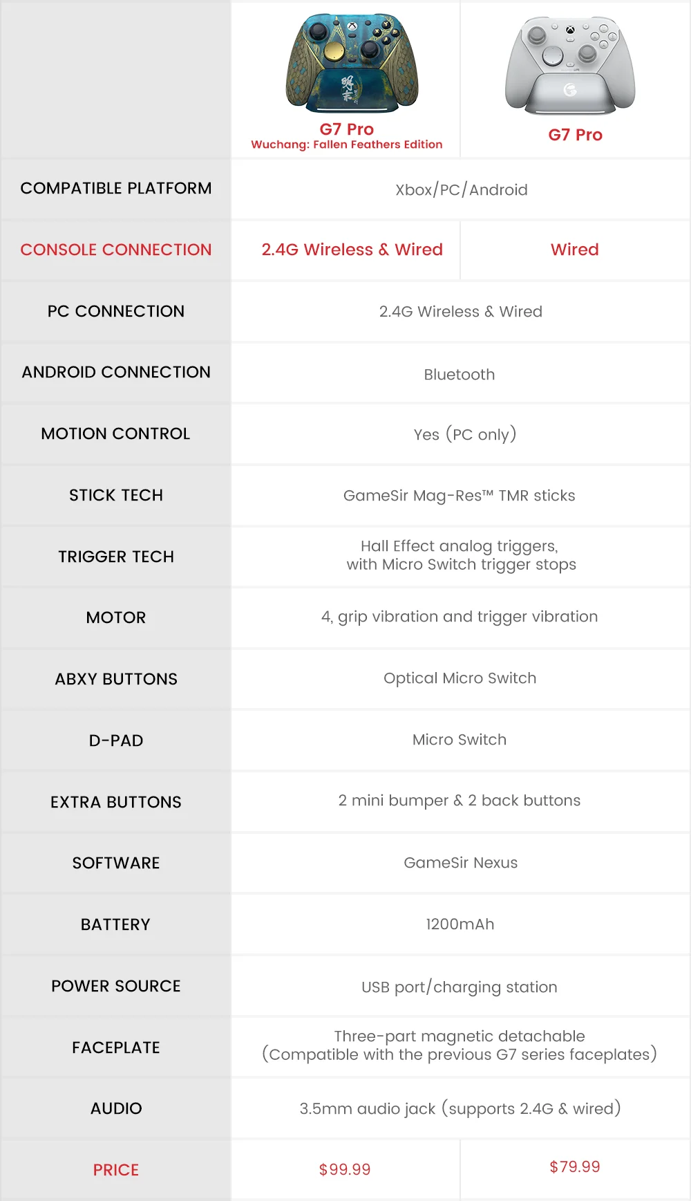 A edição G7 Pro Wuchang: Fallen Feathers apresenta quatro botões extra remaphíveis, incluindo dois mini pára-choques (R5/L5) e dois botões traseiros com fechadura (R4/L4), permitido os jogadores para personalizar seus controles.