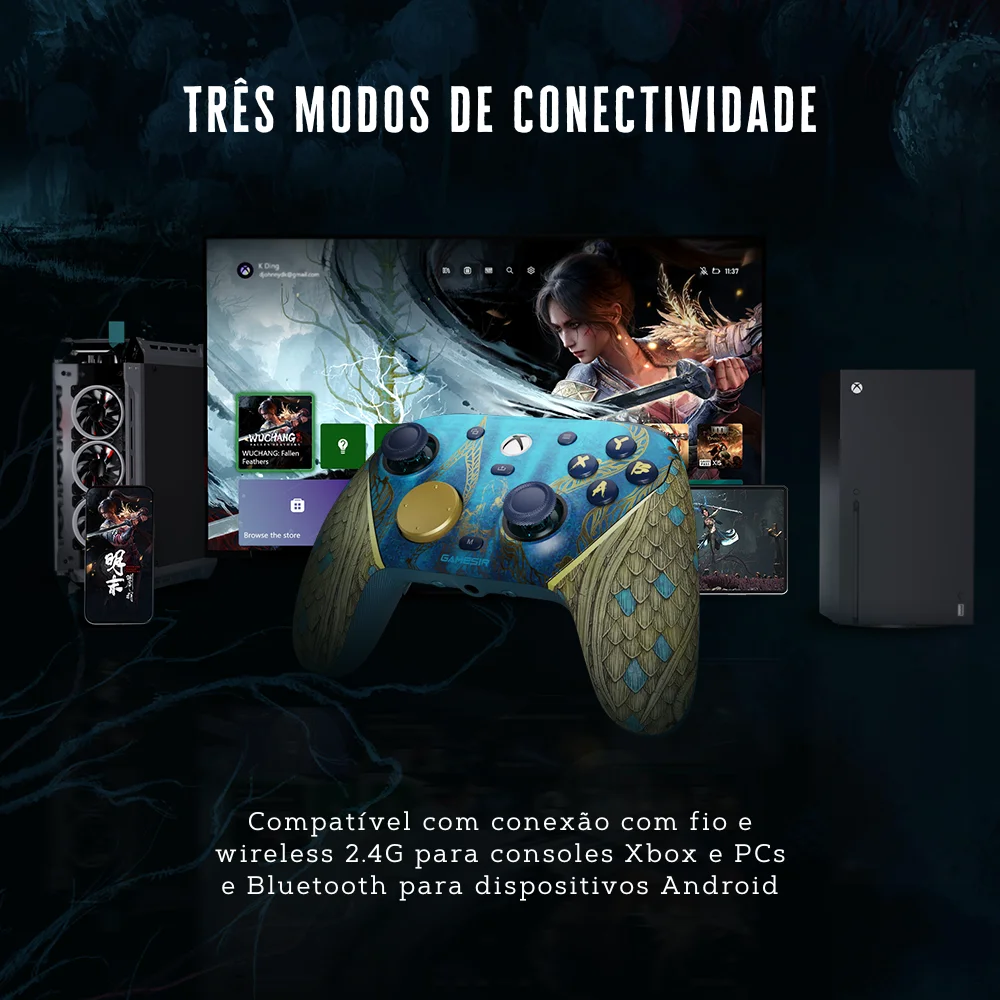 A edição G7 Pro Wuchang: Fallen Feathers suporta conectividade perfeita em Xbox, PC e Android.Ligue sem esforço entre modos usando o conveniente interruptor de modo físico.Escolha entre 2.4G sem fio e com fio para consoles e PC Xbox; Bluetooth 5.3 para Android.