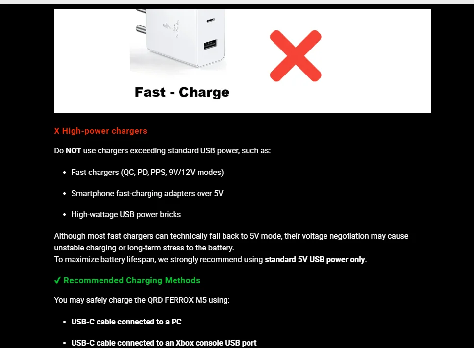 3 não use carga rápida ou adaptadores de energia.O controlador usa uma bateria embutida de 800mAh (5V/1A) e deve ser carregado apenas através de portas USB (PC/PS5/PS4/PS3) usando um cabo USB-C. O uso de carregadores rápidos pode danificar a bateria.