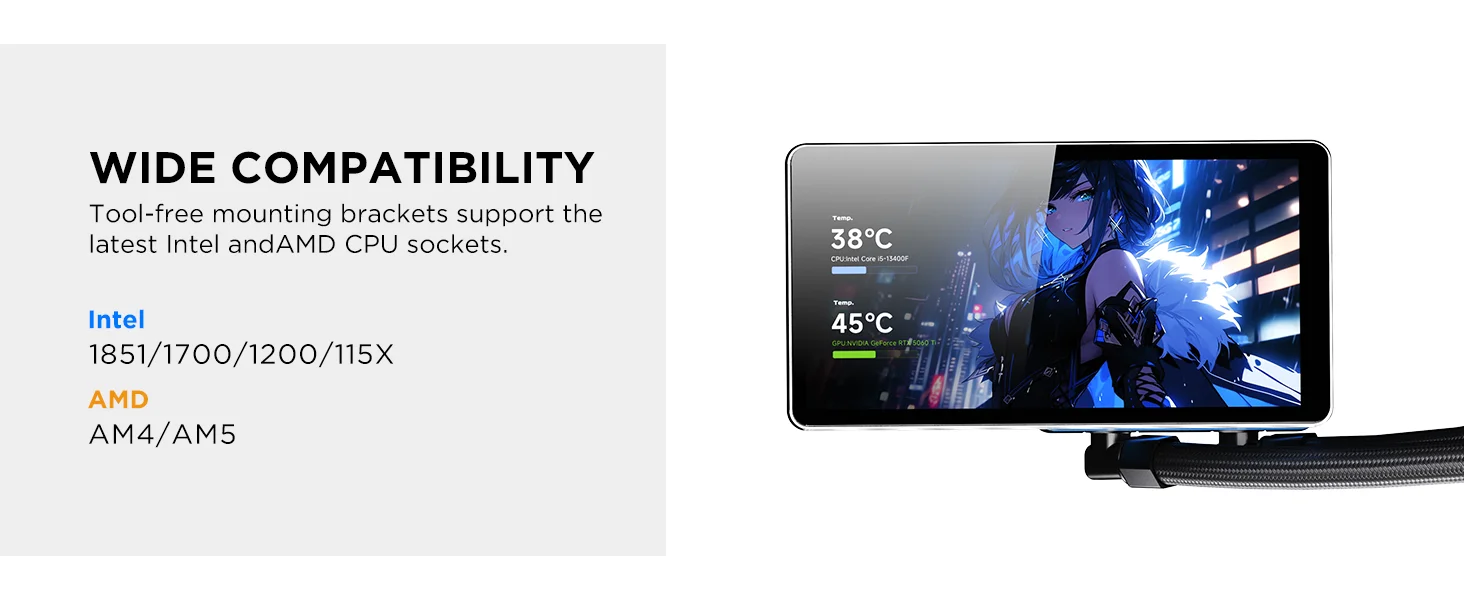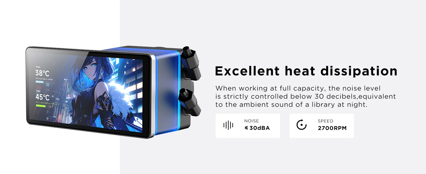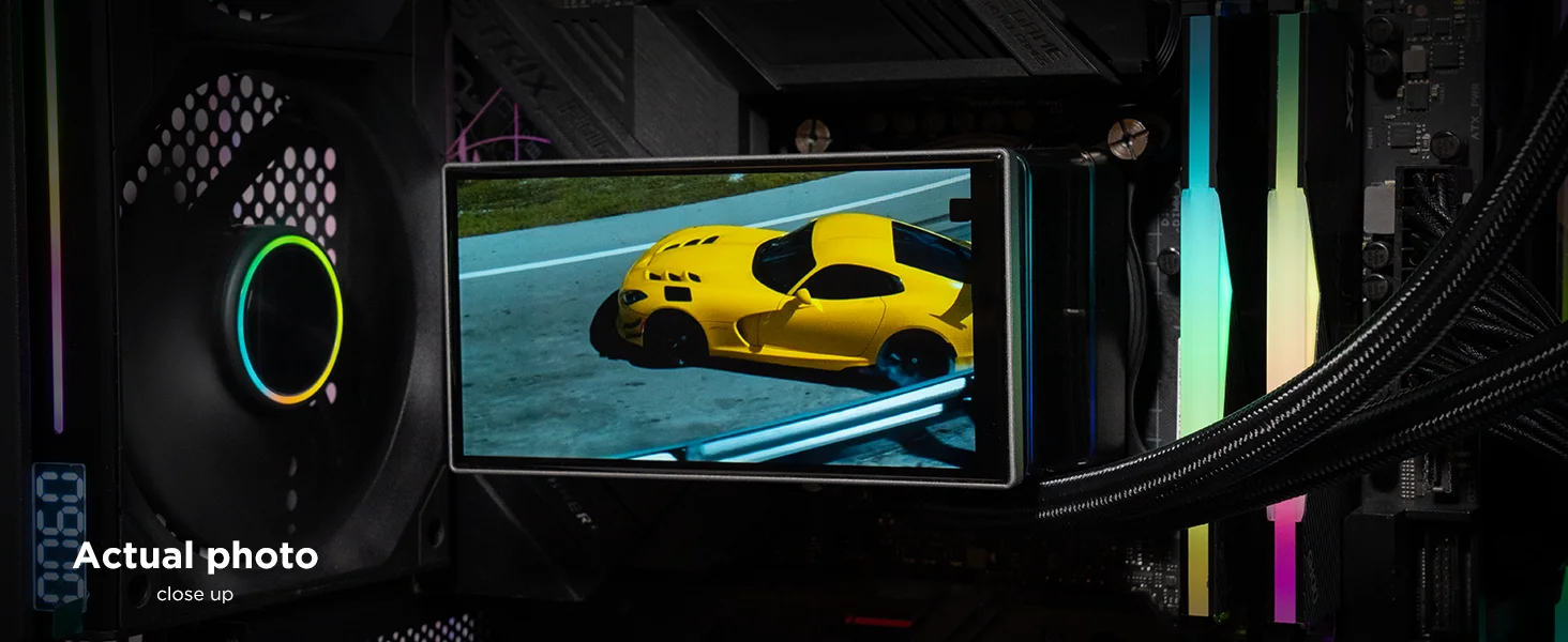 A bomba d'água vem com uma tela LCD grande de 5,5 polegadas com resolução de 960*480, fixação magnética e 270° rotação (requer conexão à porta USB 2.0 de 9 pinos da placa-mãe).