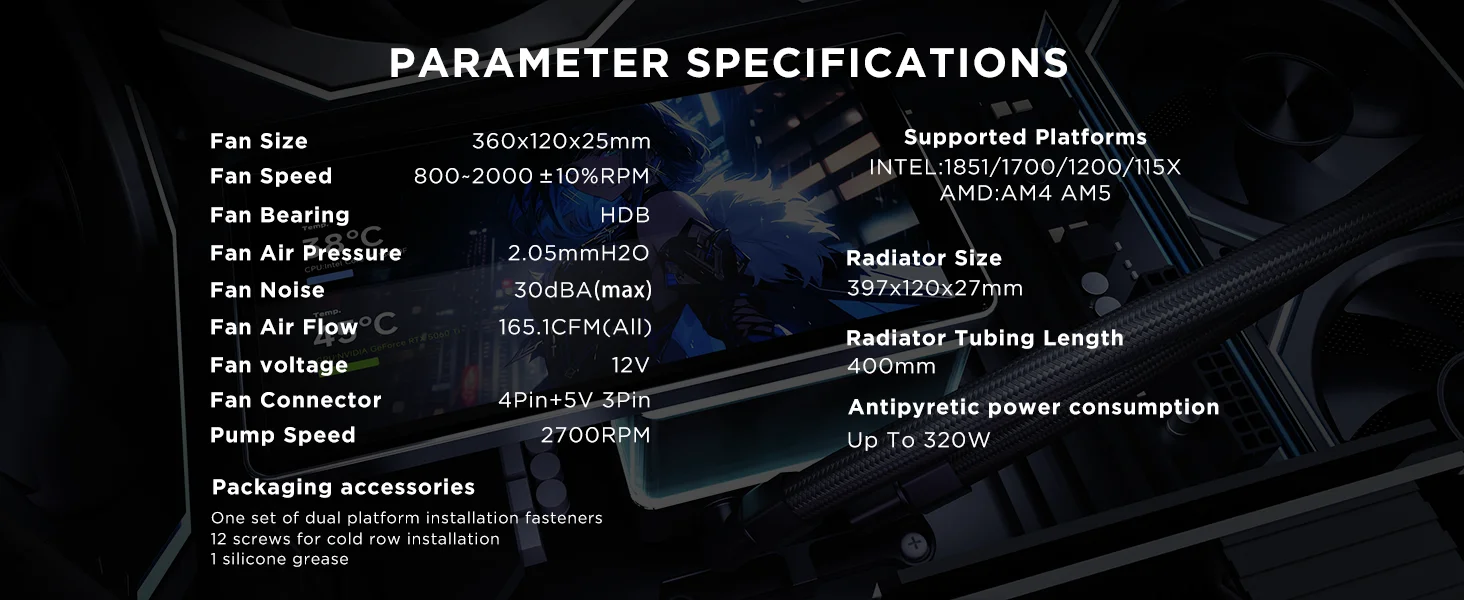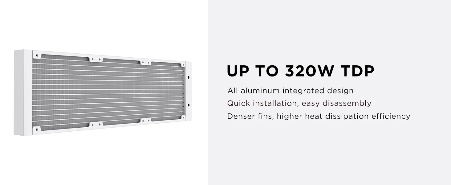 O radiador todo em alumínio e o dissipador de calor de alta densidade proporcionam maior eficiência na dissipação de calor.O Aio tem um TDP de 320W.