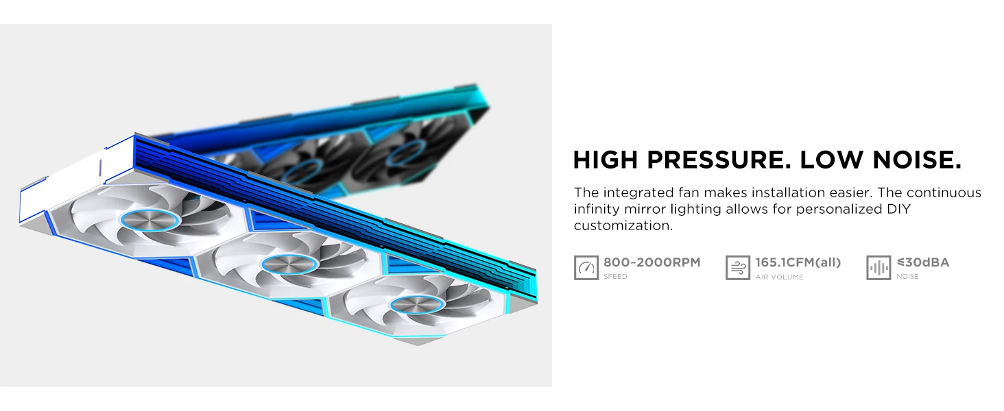 O AIO possui uma ventoinha ARGB integrada de 360 mm com espelhos infinitos nas laterais e uma luz triangular de espelho infinito entre as ventoinhas.Os parafusos não são visíveis, permitindo a sincronização da iluminação da placa-mãe e o ajuste do software.(Certifique-se de que sua placa-mãe tenha um conector de 5V de 3 pinos.)Soquetes ARGB (caso contrário, você precisará de um controlador ARGB)