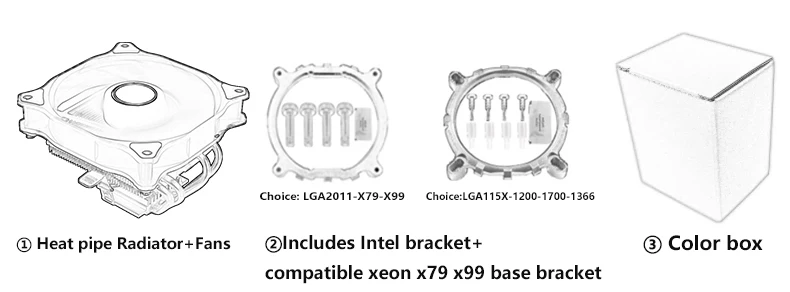 Embalagem: Caixa Colorida (Cooler para CPU*1, Inclui 1 conjunto de suporte base Intel e parafusos, suporte base Xeon-x79x99 + parafusos * 1 conjunto, pasta térmica de silicone*2)