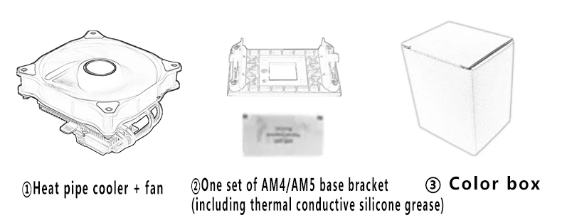 Embalagem: Caixa colorida (cooler de CPU * 1, adaptador de suporte de base compatível com slot AM4/AM5 * 1, pasta térmica de silicone * 1)