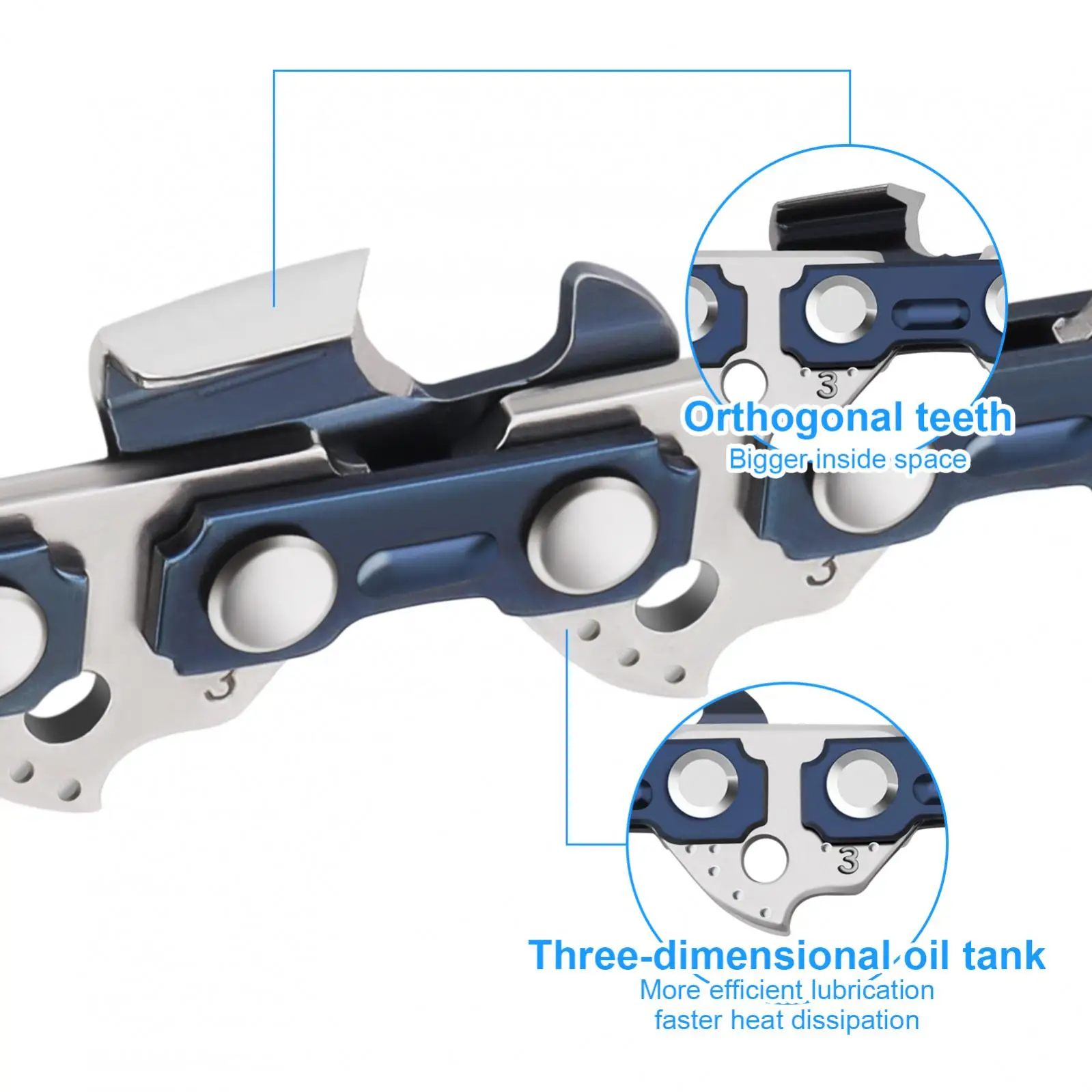 - Maior resistência ao desgaste: camada externa de cromo duro industrial premium e rebites endurecidos ajudam a reduzir o desgaste e os ajustes da corrente e obtêm desempenho mais duradouro.Para que possa suportar condições de corte exigentes e manter sua nitidez por períodos mais longos.