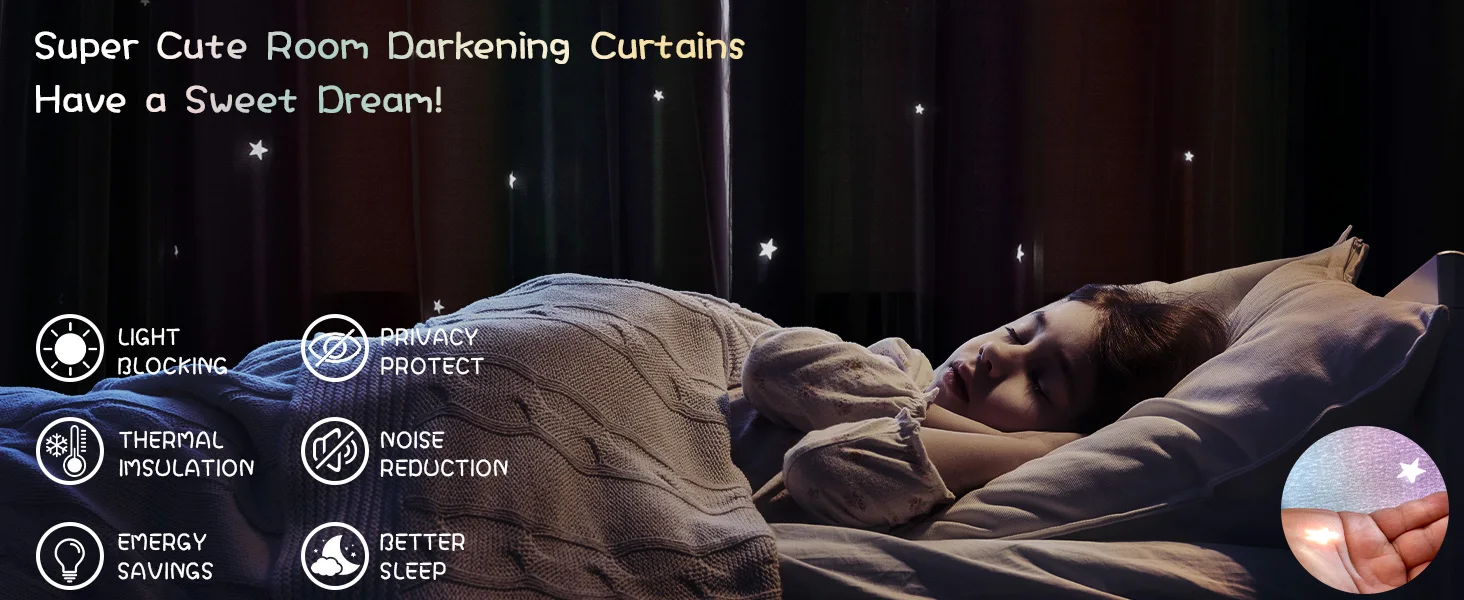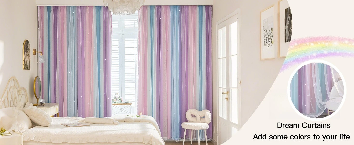 MATERIAL DE ALTA QUALIDADE:A camada da cortina transparente é feita de tecido de malha de vestuário de alta qualidade com bordas de renda de alta qualidade na parte inferior e nas bordas laterais.A camada de cortina blackout é um tecido de poliéster com um processo especial de tecelagem de três camadas, apenas tecidos de poliéster de alta qualidade podem imprimir boas cores e ter uma mão bonita, e as estrelas cortadas são mais completas, as cortinas têm melhor caimento e 80% de blackout.