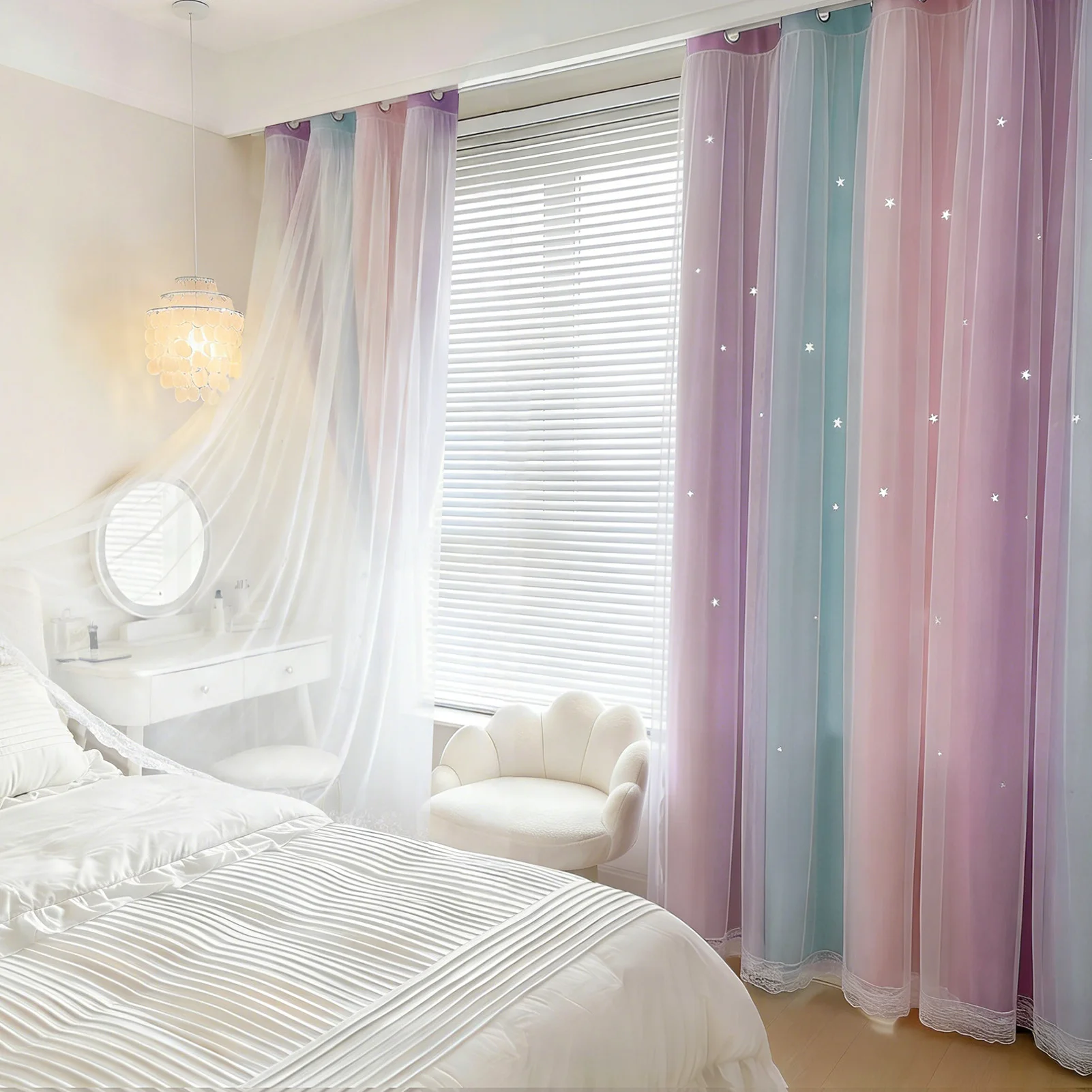 DESIGN ÚNICO: TAs cortinas têm um design integrado de duas camadas, com uma camada transparente que adiciona fofura e moda.A leveza e a transparência do tecido transparente criam uma atmosfera romântica e nebulosa.Nas cortinas blackout impressas, existem padrões de estrelas vazadas que brilham como estrelas quando a luz passa, criando uma sala sonhadora.As cortinas blackout também apresentam uma impressão digital em três cores que se misturam gradativamente, com combinações de cores coordenadas para realçar o efeito decorativo.