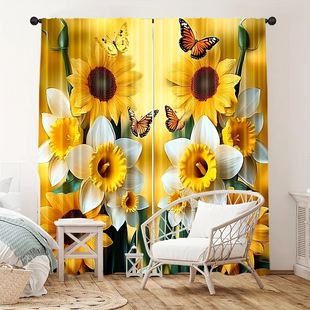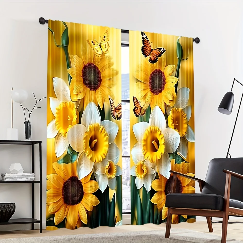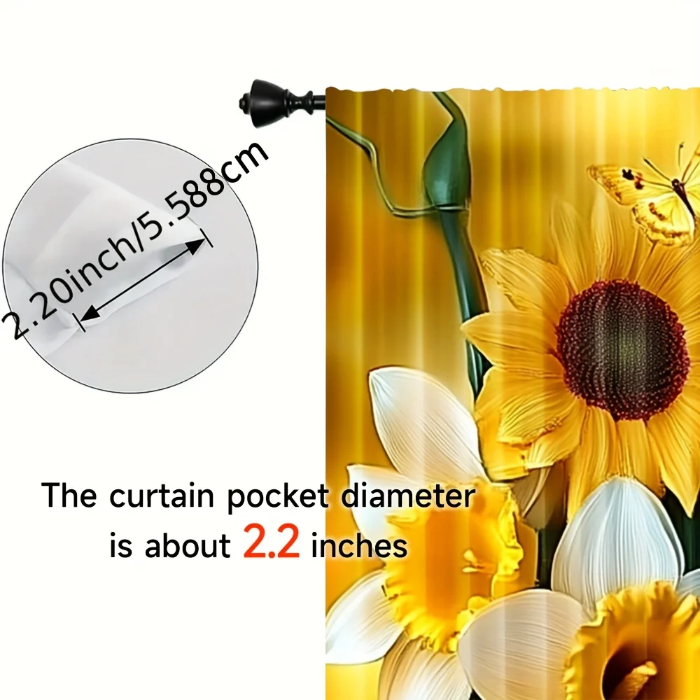 Cortinas com estampa de girassol e borboleta, 2 peças – poliéster, parte superior de haste de bolso para quarto, sala de estar, escritório – decoração de casa para todas as estações