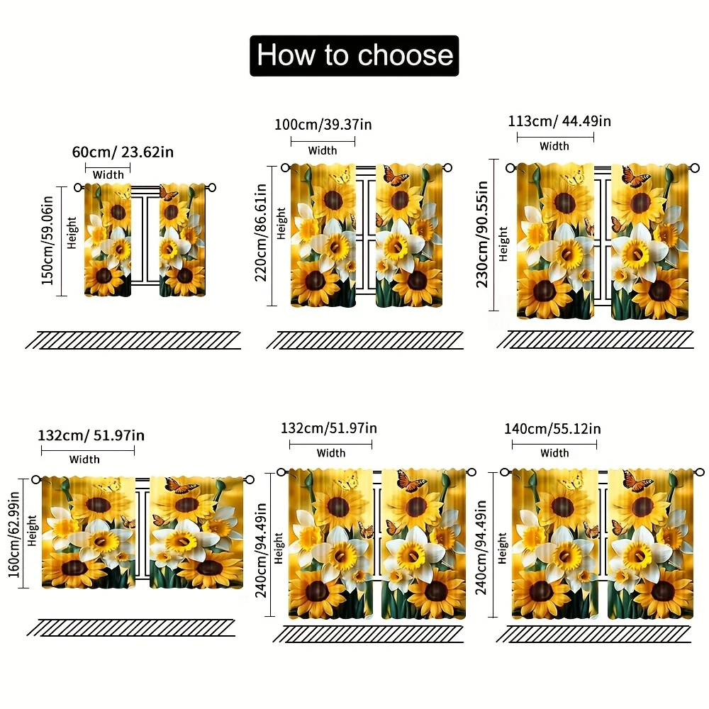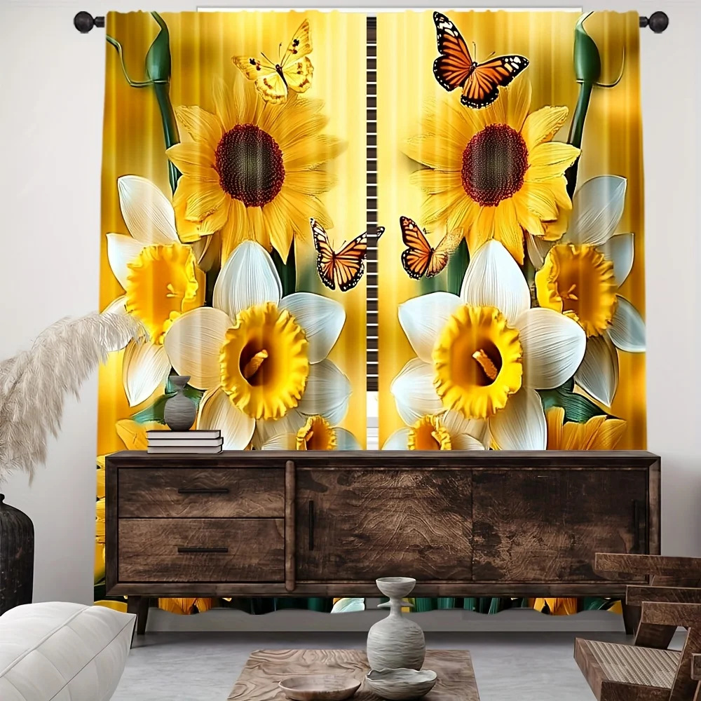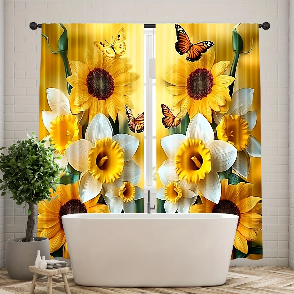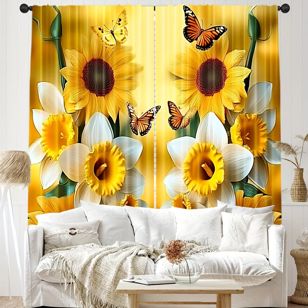 Cortinas com estampa de girassol e borboleta, 2 peças – poliéster, parte superior de haste de bolso para quarto, sala de estar, escritório – decoração de casa para todas as estações
