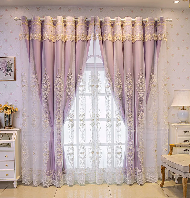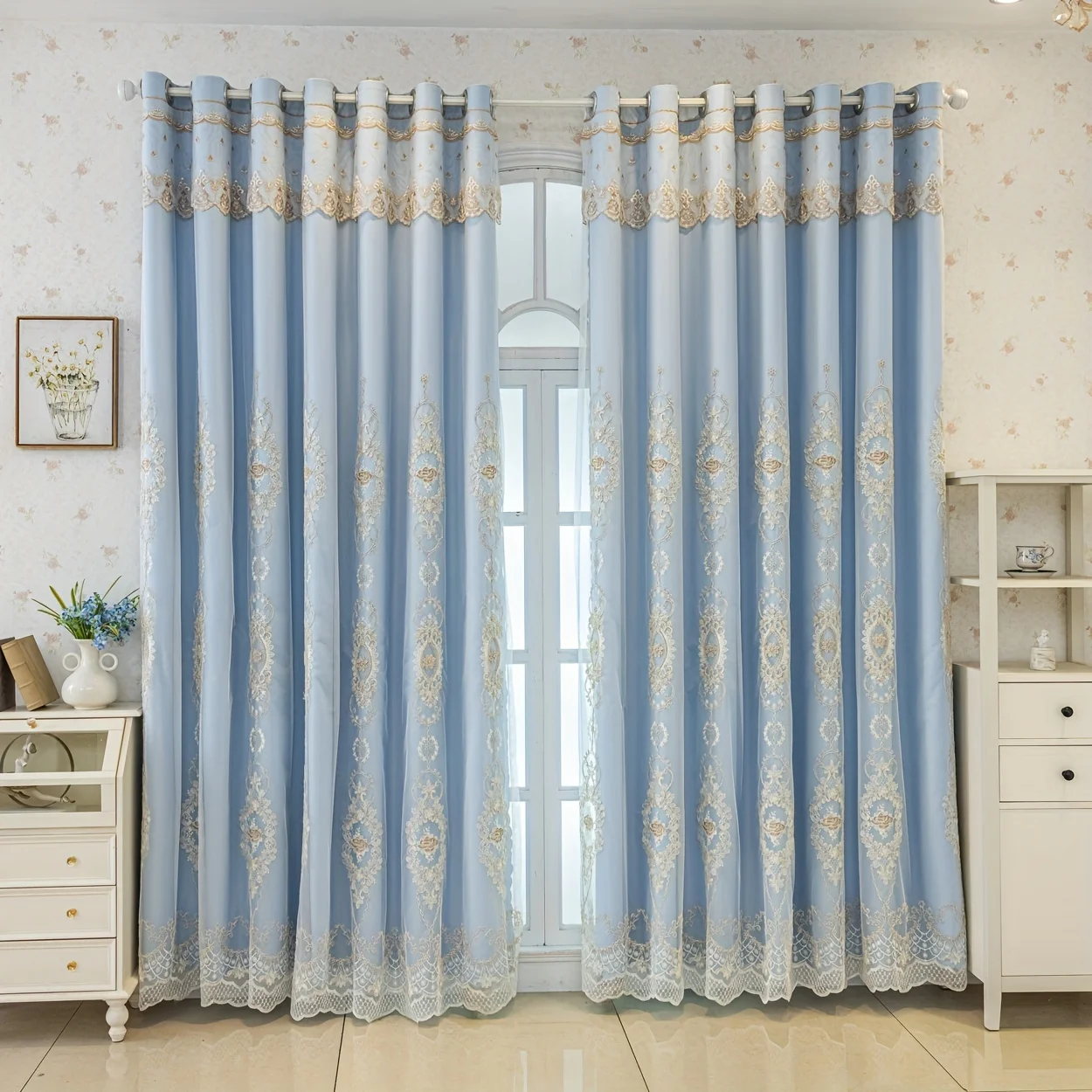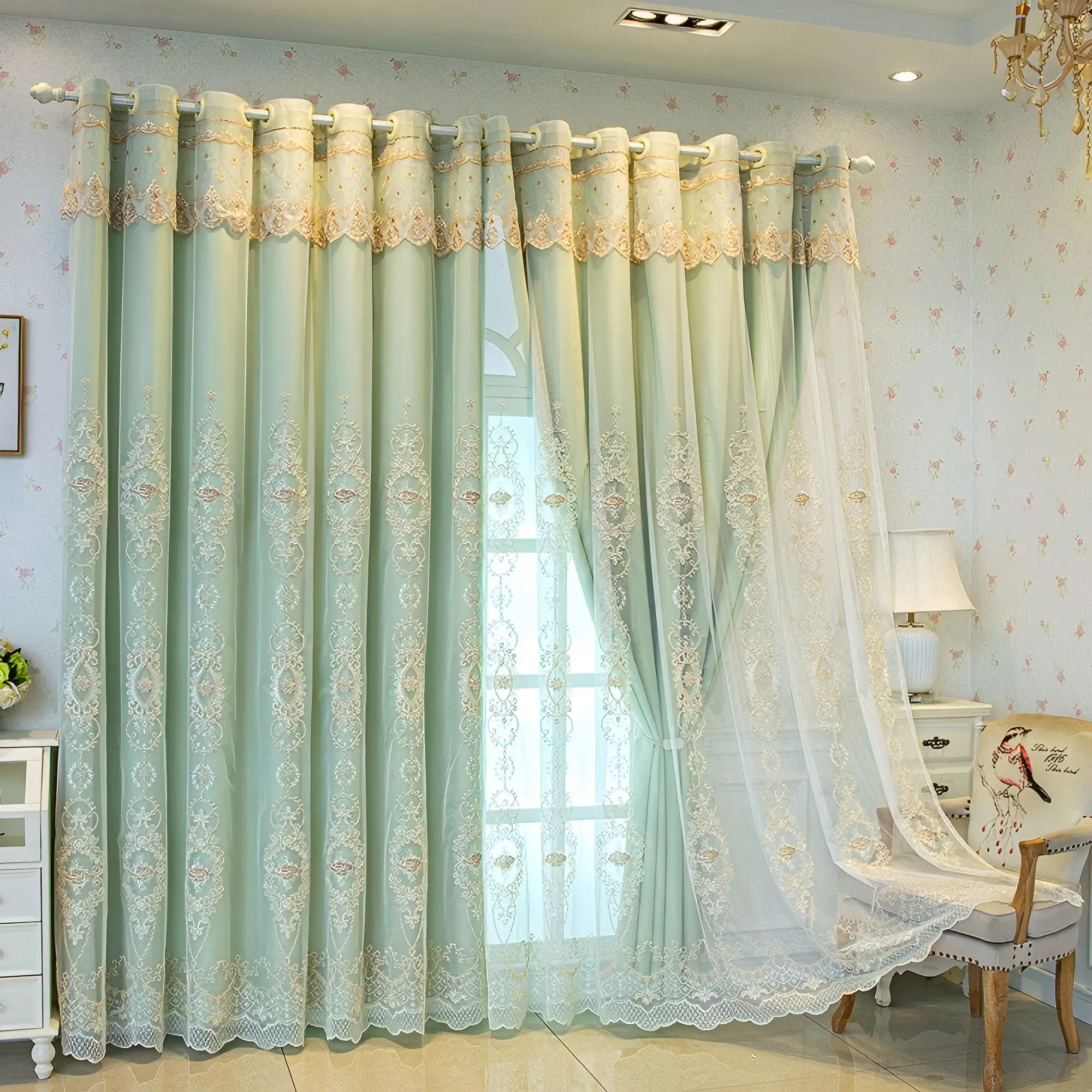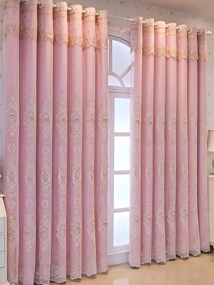 Cortinas Estilo Princesa Rosa 2 em 1, Forro Blackout Completo + Voal Bordado com Rosas Douradas, Cortina Pronta para Quarto e Sala de Estar