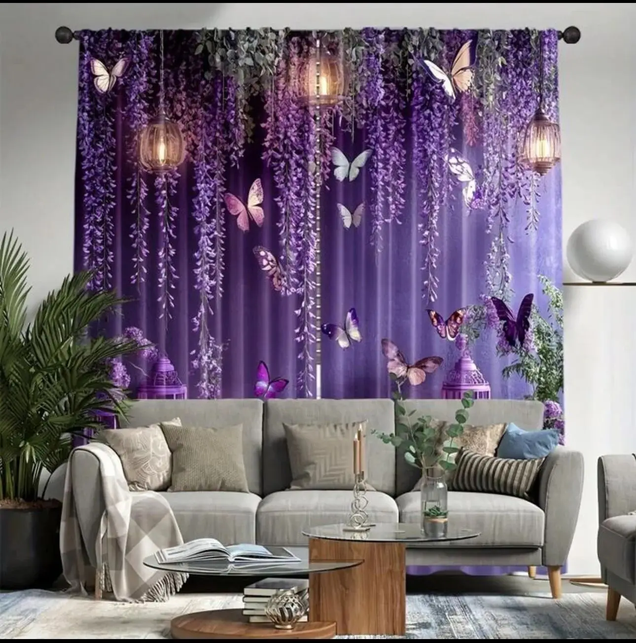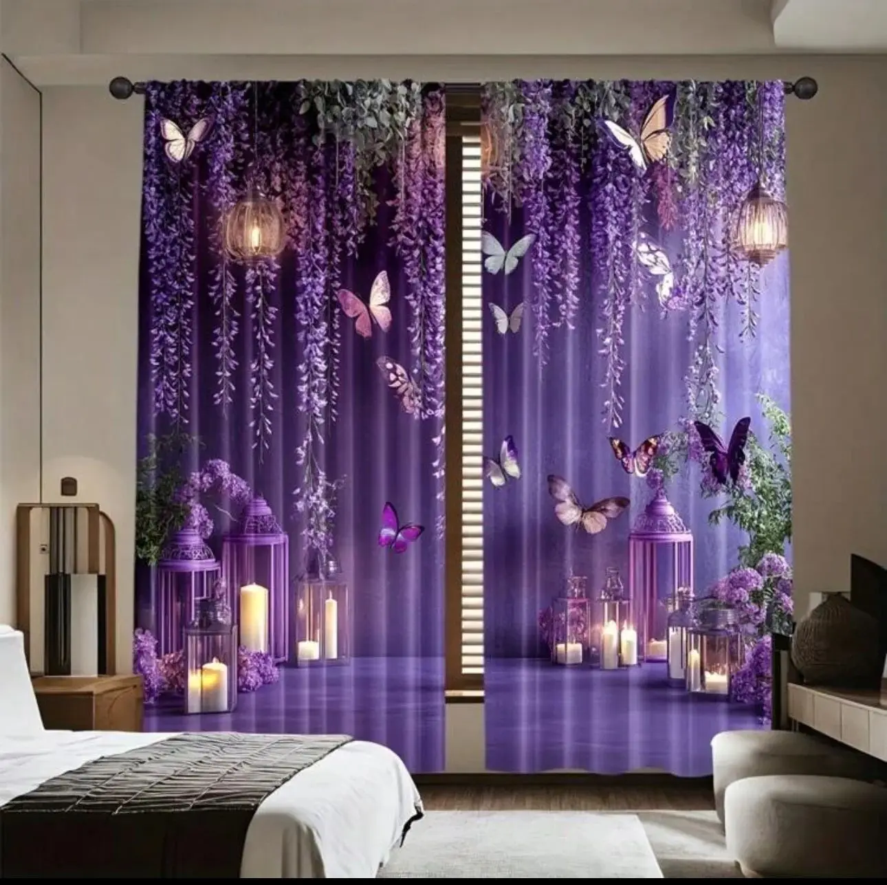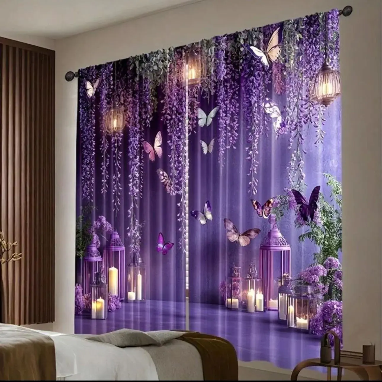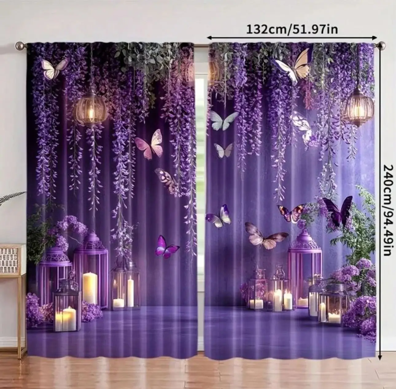 Cortinas Românticas VIKAMA em Roxo Floral com Padrão de Borboleta e Lanterna para Quarto Principal ou Quarto de Princesa