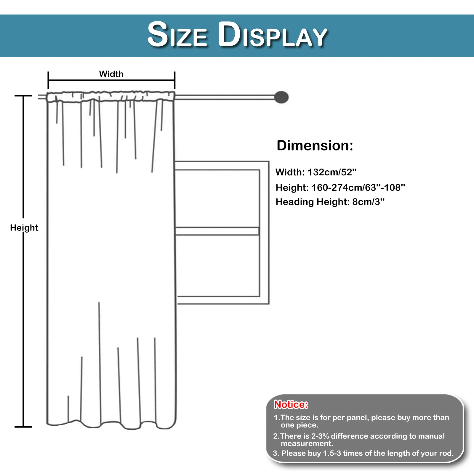 Size(W*H): 132x160cm/52''*63''; 132x213cm/52''*84''; 132x241cm/52''*95''; 132x274cm/52''*108''