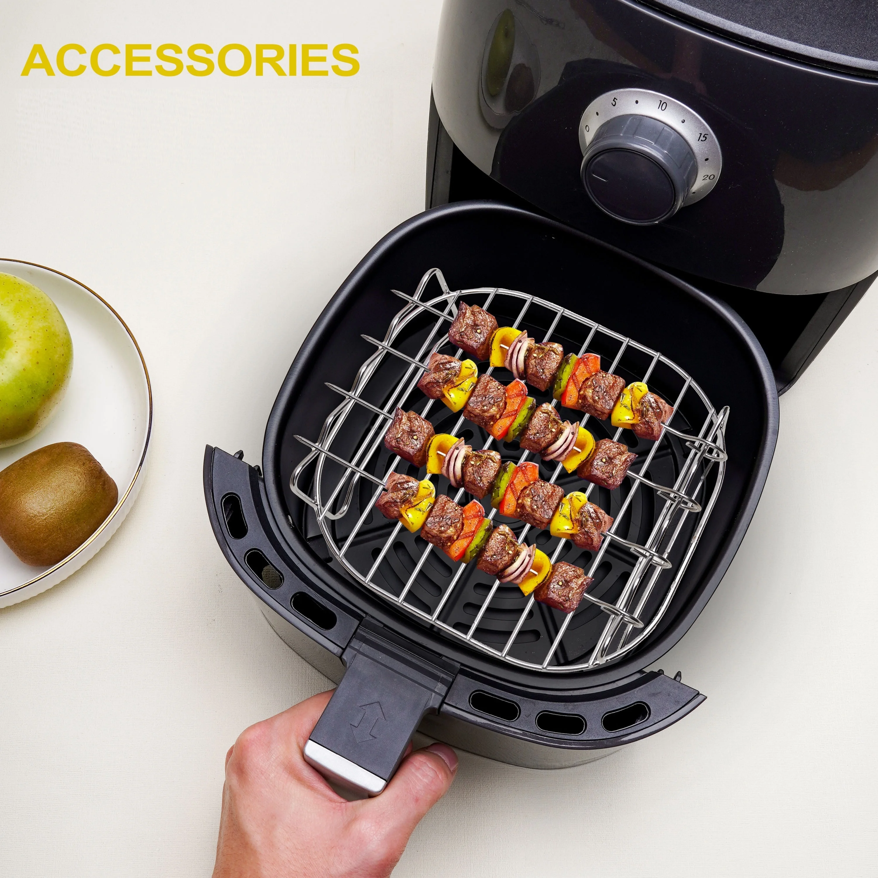 Rack de camada dupla para receitas de fritadeira de ar mais versáteis.Maximize a superfície de aquecimento dos alimentos, use espetos para shish kabob na camada superior e outros alimentos na camada da grelha.