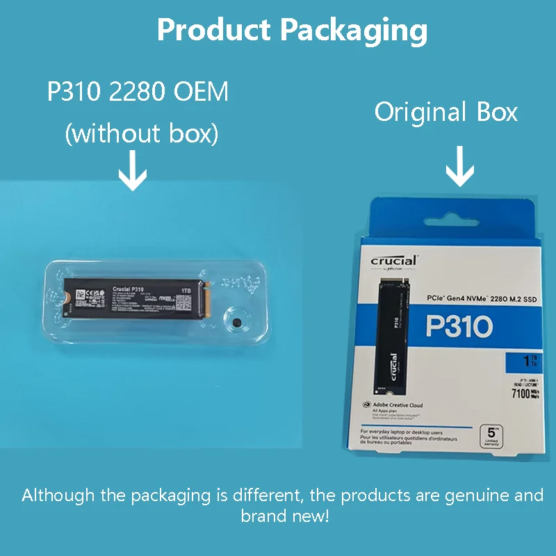 Os produtos de unidade de estado sólido P310 vêm nos tamanhos 2230 e 2280. Por favor, confirme se o tamanho do seu computador é adequado antes de comprar. Nossa embalagem de produto é dividida em embalagem OEM e embalagem em caixa, ambas produtos genuínos e novos. Por favor compre de acordo com suas necessidades