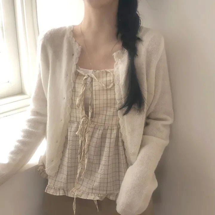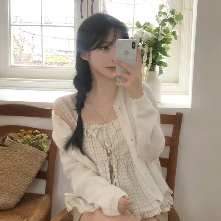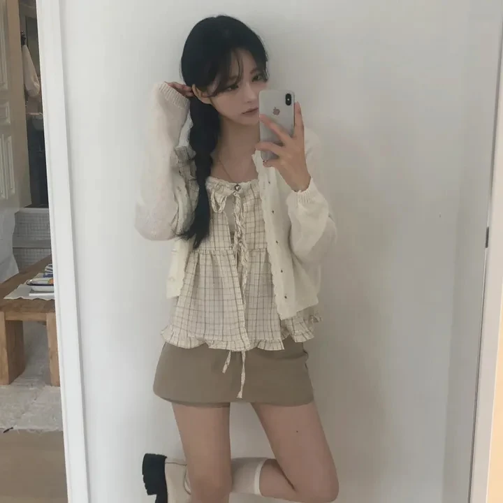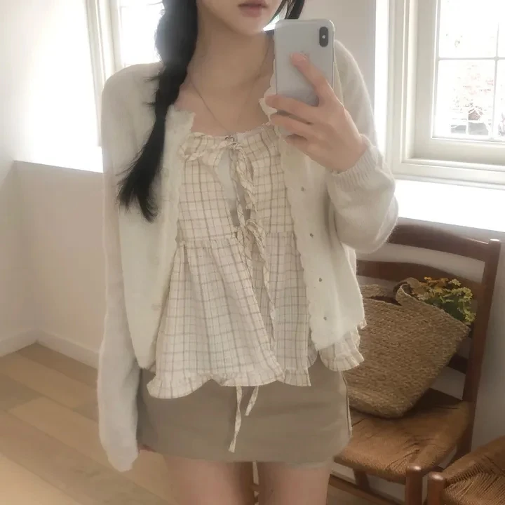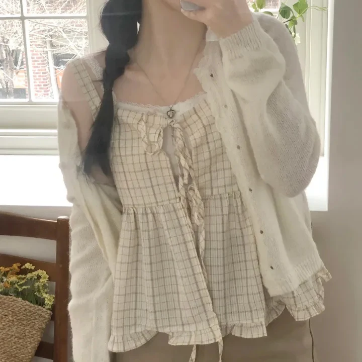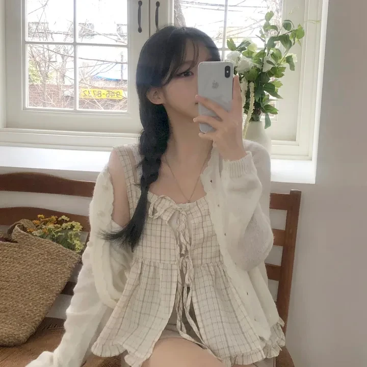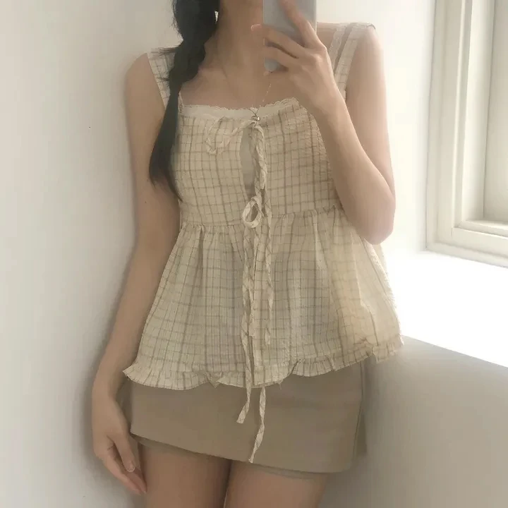 Csa Fena Solta Primavera Verão Nova Moda Coreana Xadrez com Amarração nas Costas Top Versátil com Alças Estiloso para ...