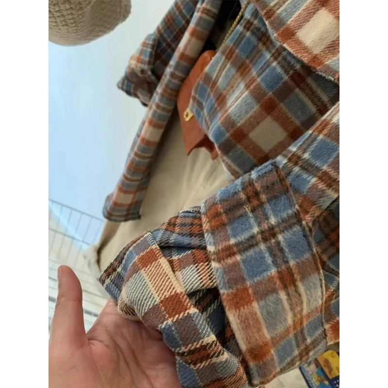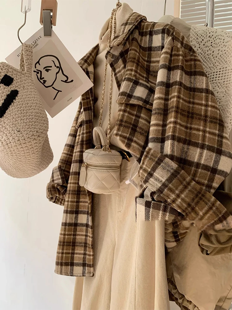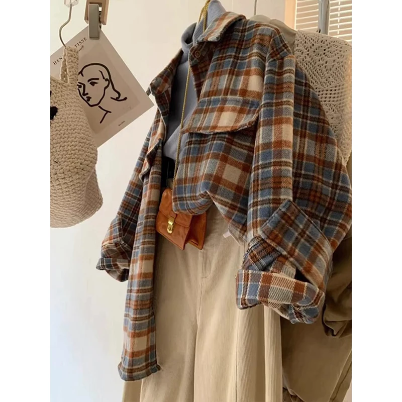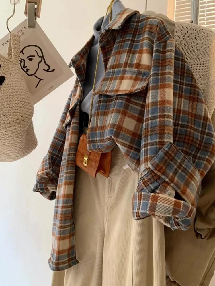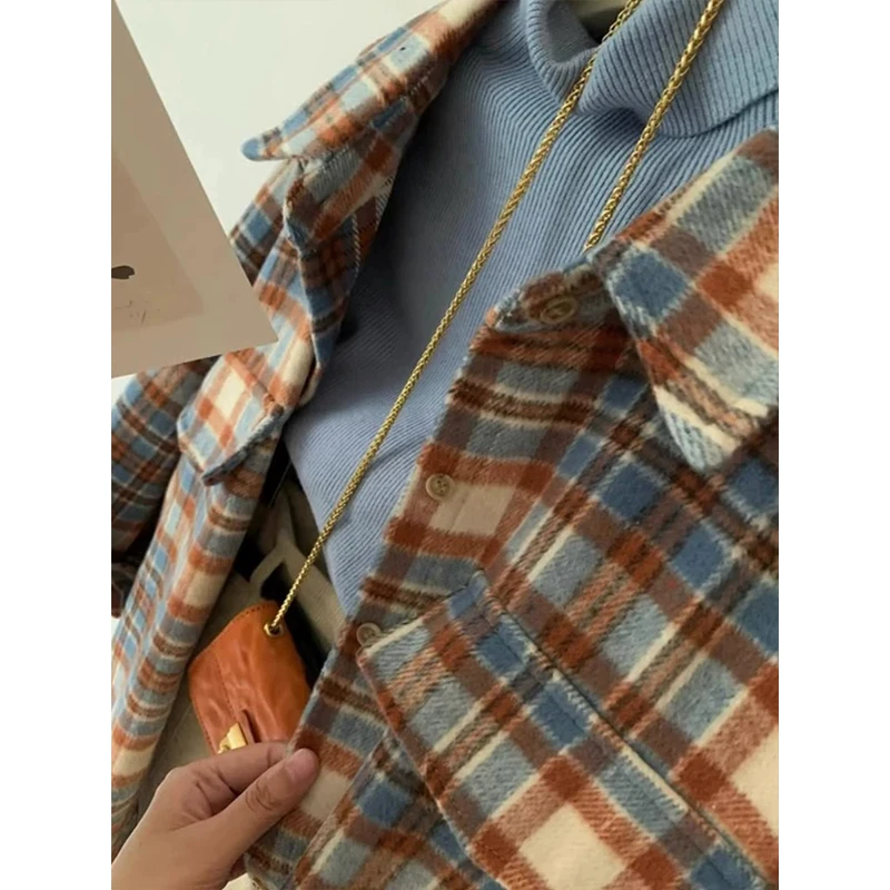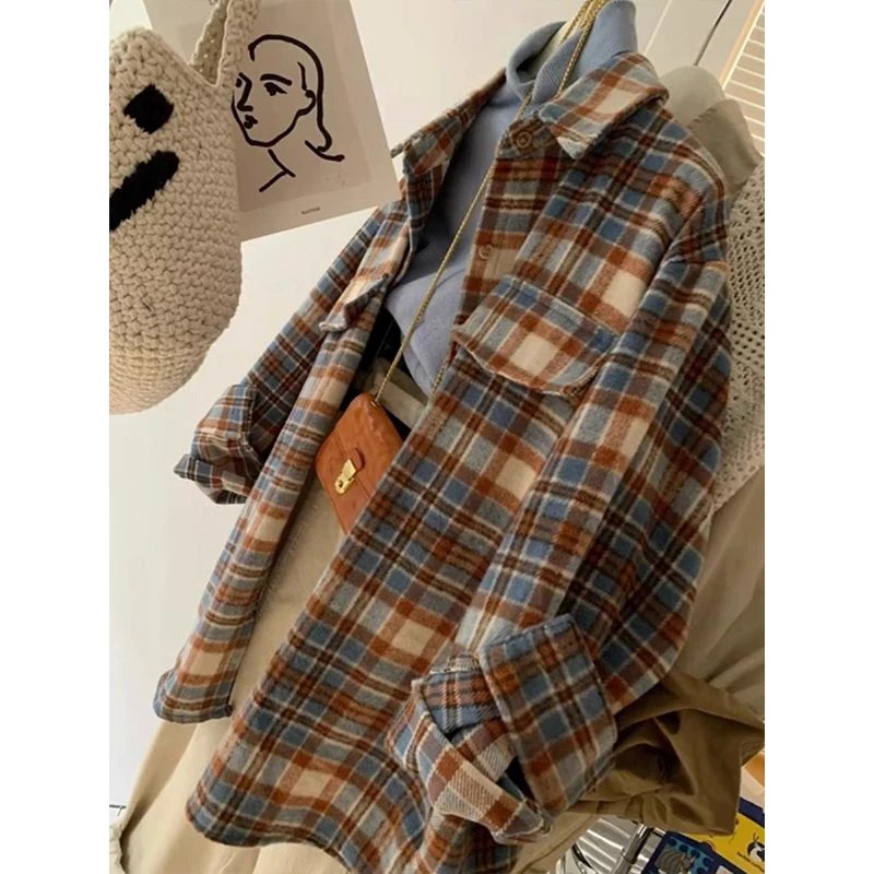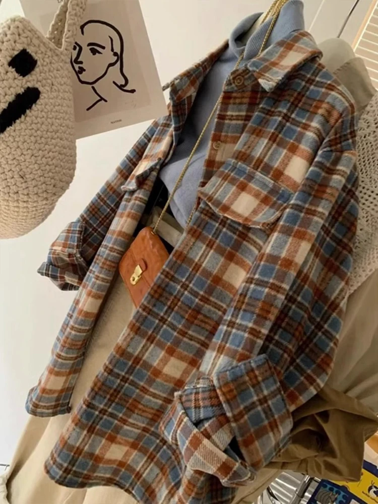 Csa Xadrez Retro com Bloco de Cores, Casaco Midi Solto para Mulheres, Estilo Coreano, Moda para o Trabalho, Manga Longa co...