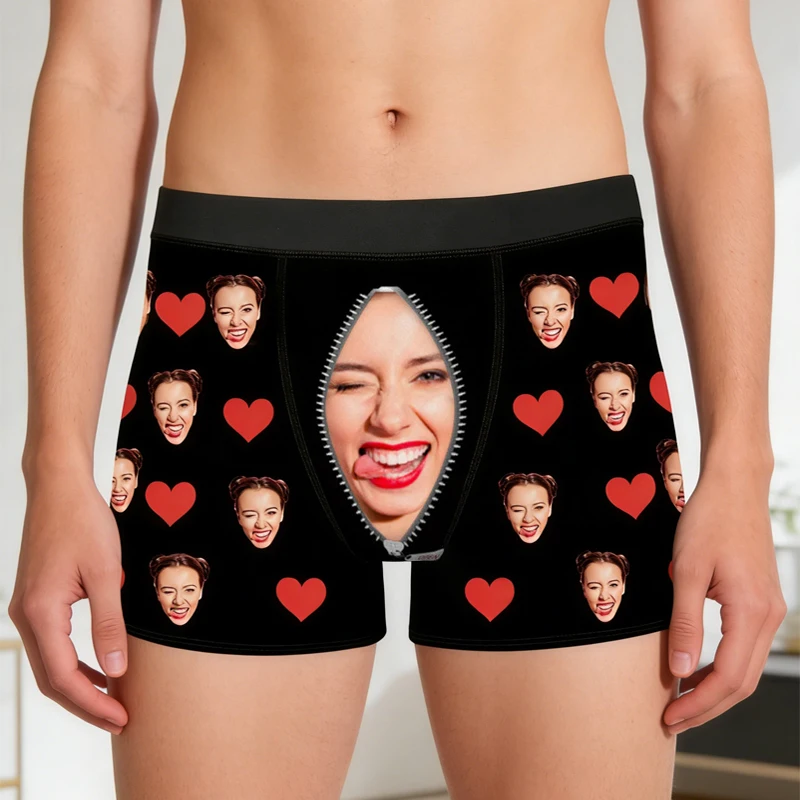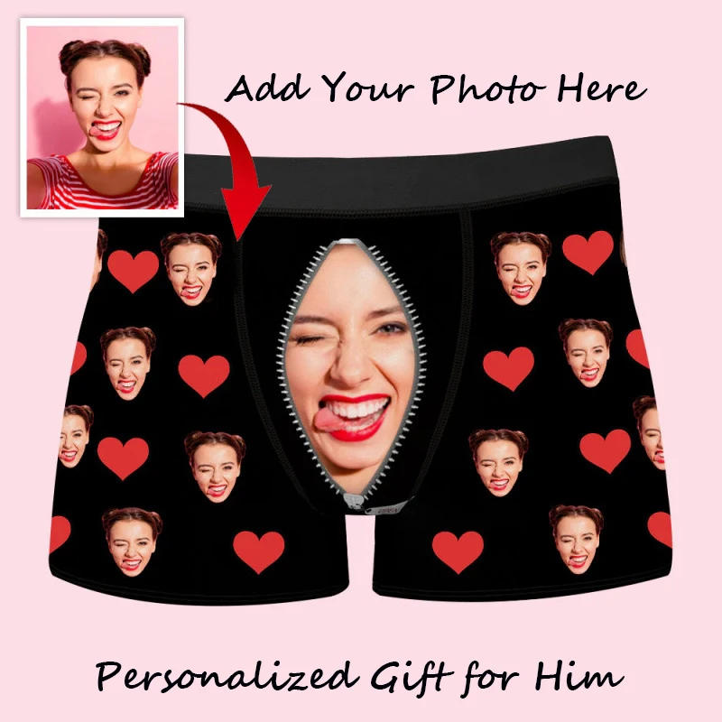 Cuecas Boxer Personalizadas com Foto de Rosto, Estampa de Coração - Presente Ideal de Dia dos Namorados para Marido, Namorado, Aniversário ou Dia dos Pais.