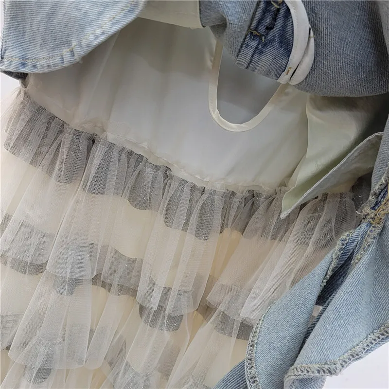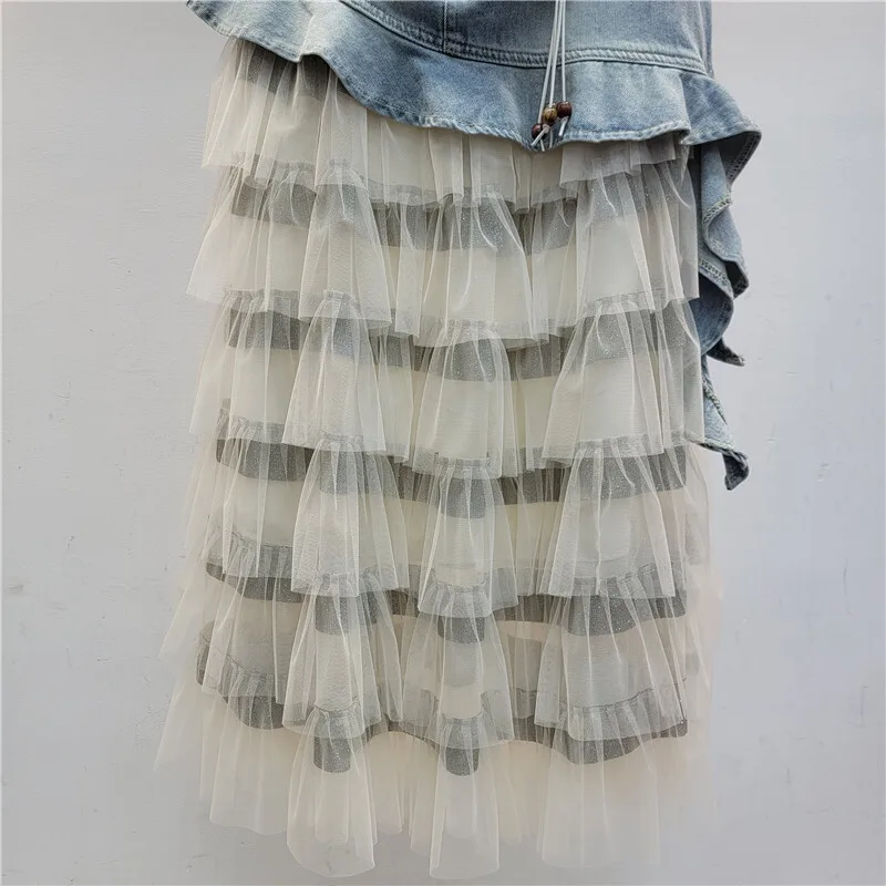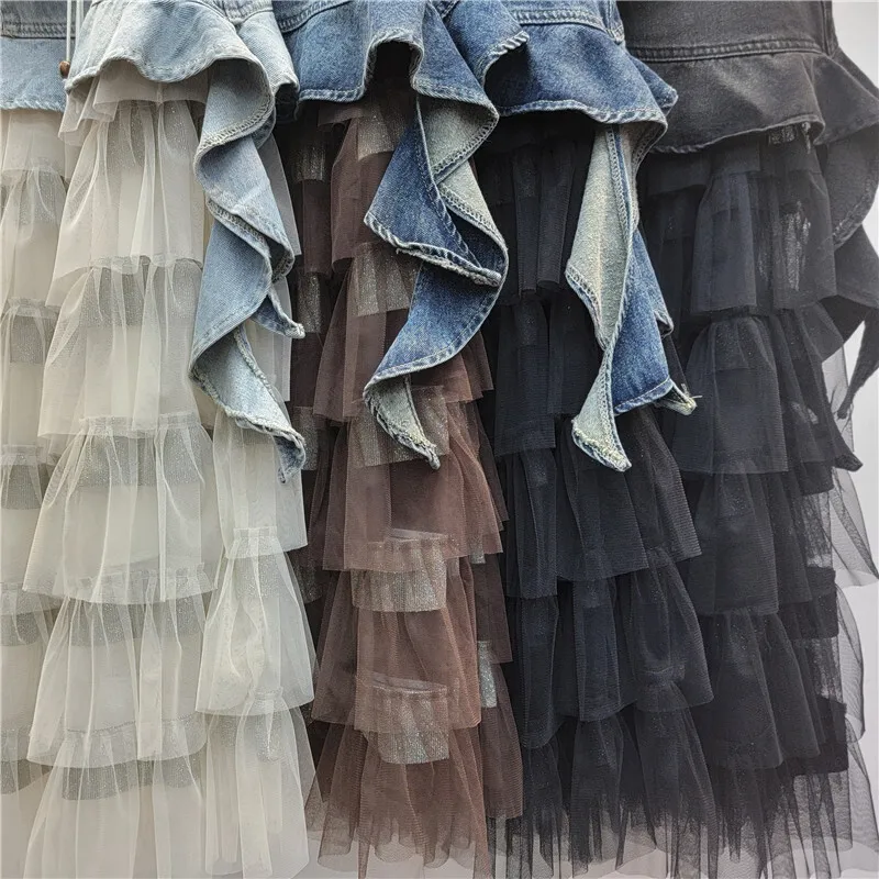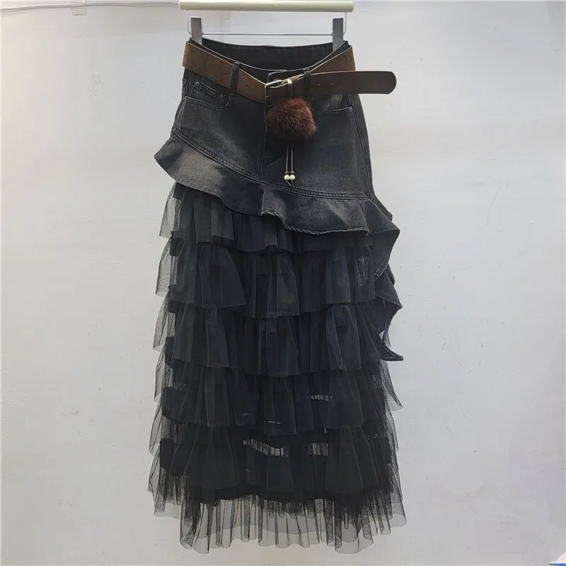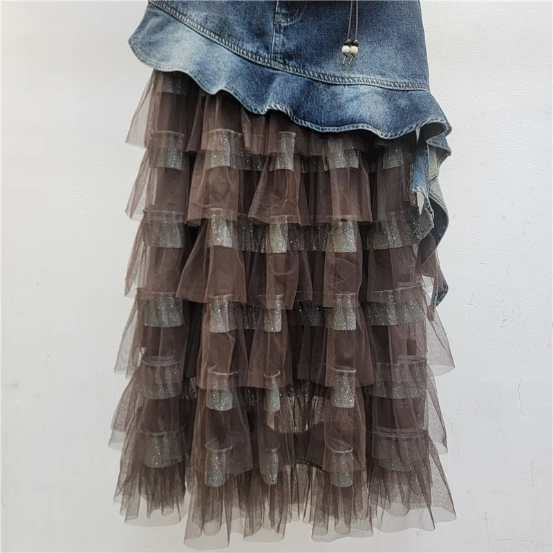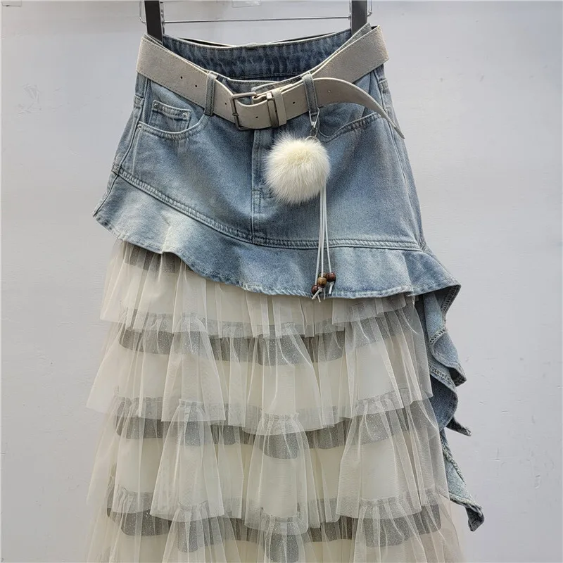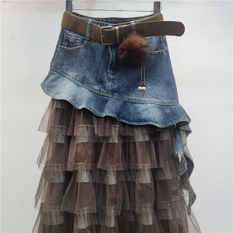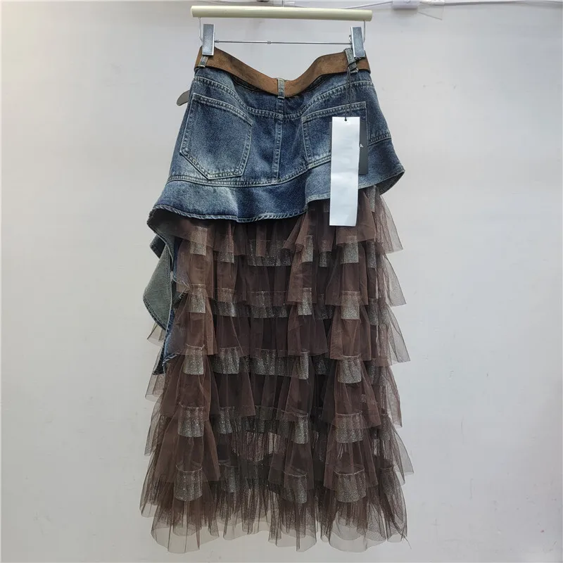 Deat 2025 outono nova moda denim plissado irregular retalhos malha cintura alta comprimento médio a linha saias de bolo para mulher 11a07201