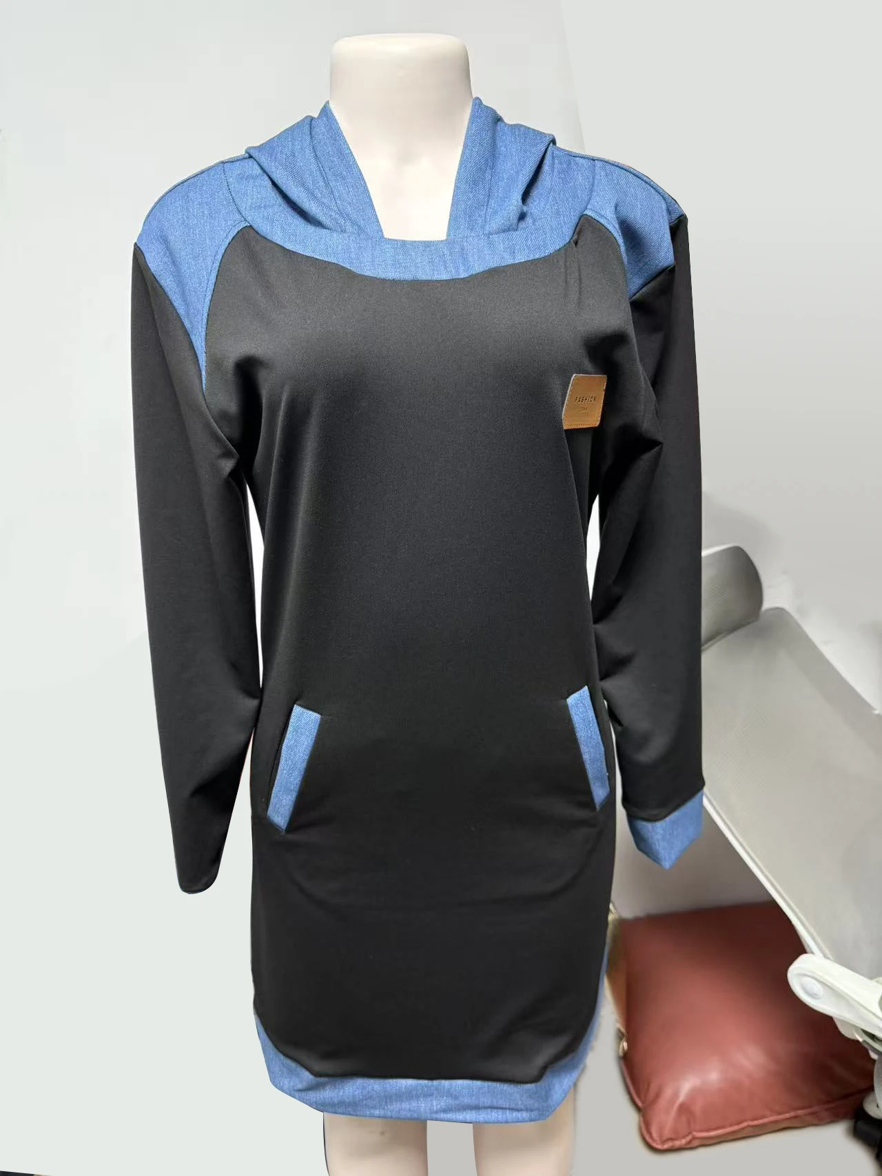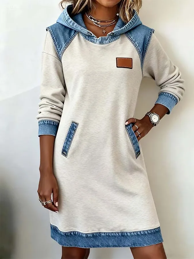 Denim contraste hoodies moletom vestido retro mulher casual retalhos com capuz pulôver vestido outono manga longa bolso vestido de festa