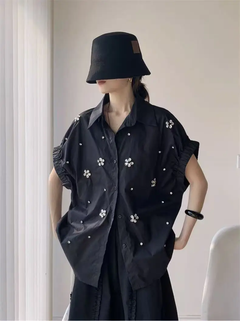 Design de luxo brilhante diamantes bordado algodão manga curta blusas camisas femininas 2025 primavera verão nova moda tendência topos