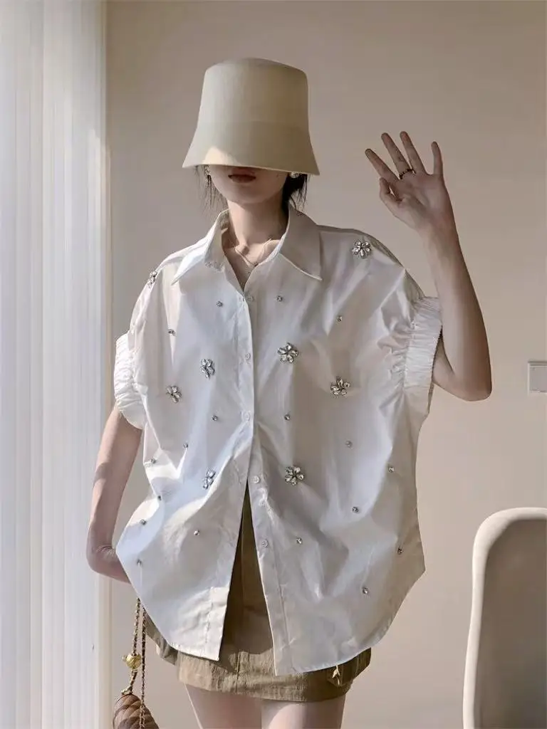 Design de luxo brilho diamantes bordado algodão manga curta blusas camisas femininas 2025 primavera verão nova moda tendência topos