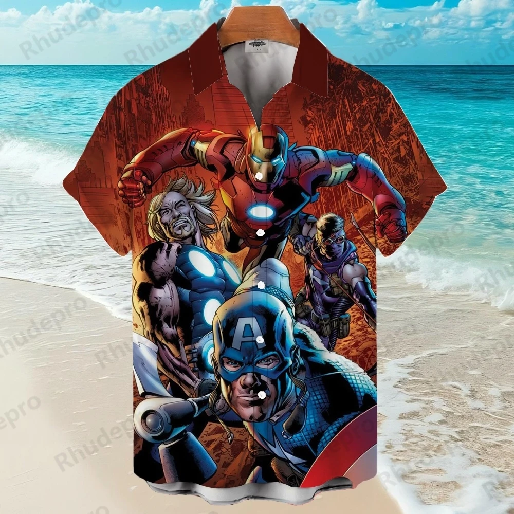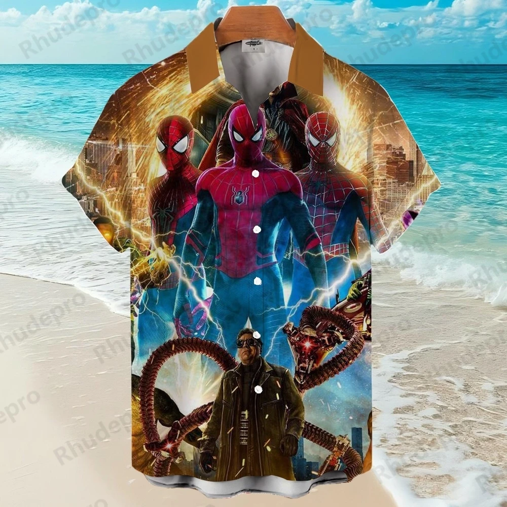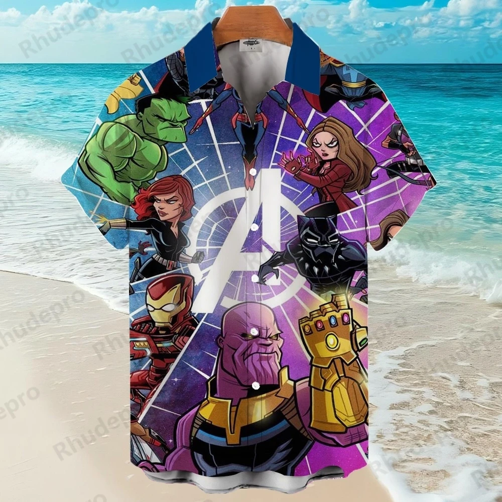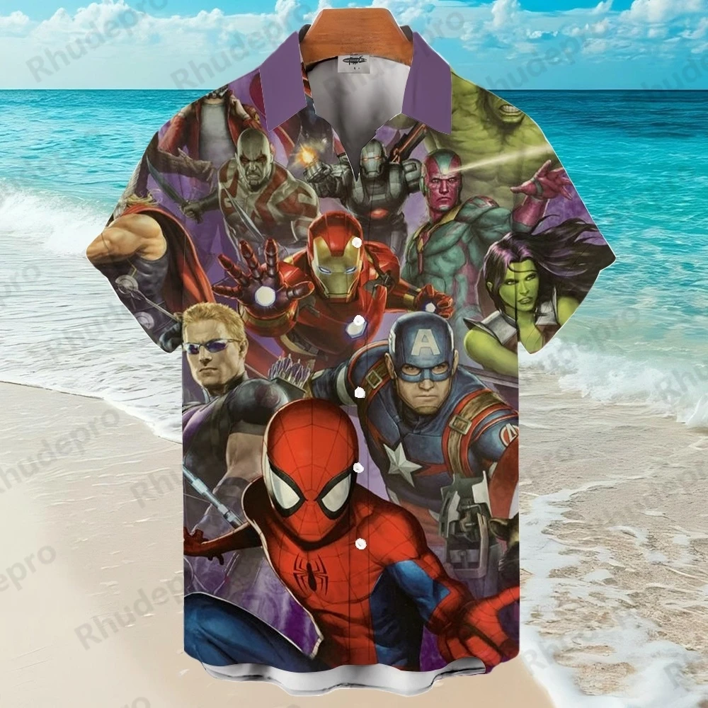 - > Disney 2025 homem-aranha os vingadores dos desenhos animados camisa havaiana impressão lapela masculina manga curta única camisa casual na moda versátil