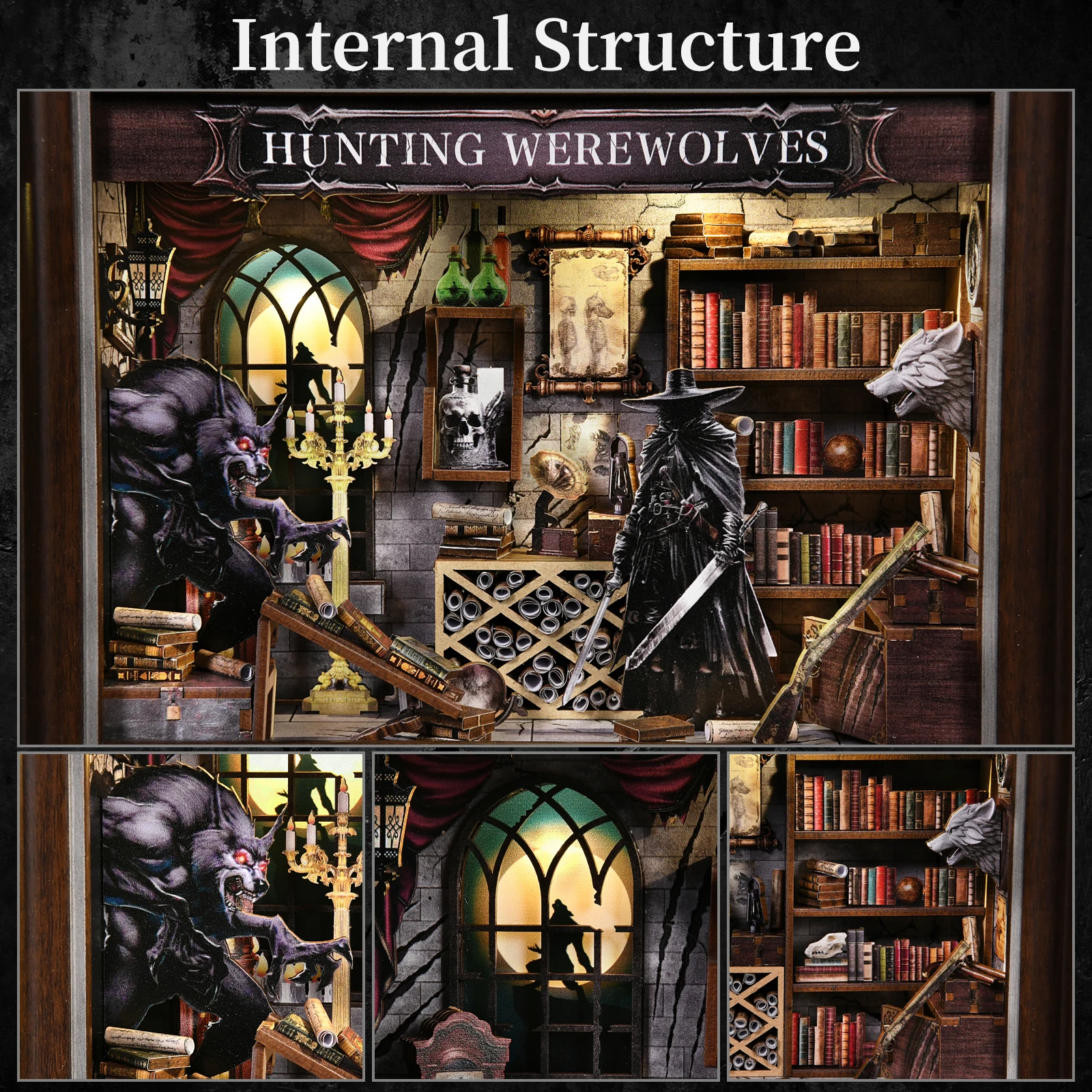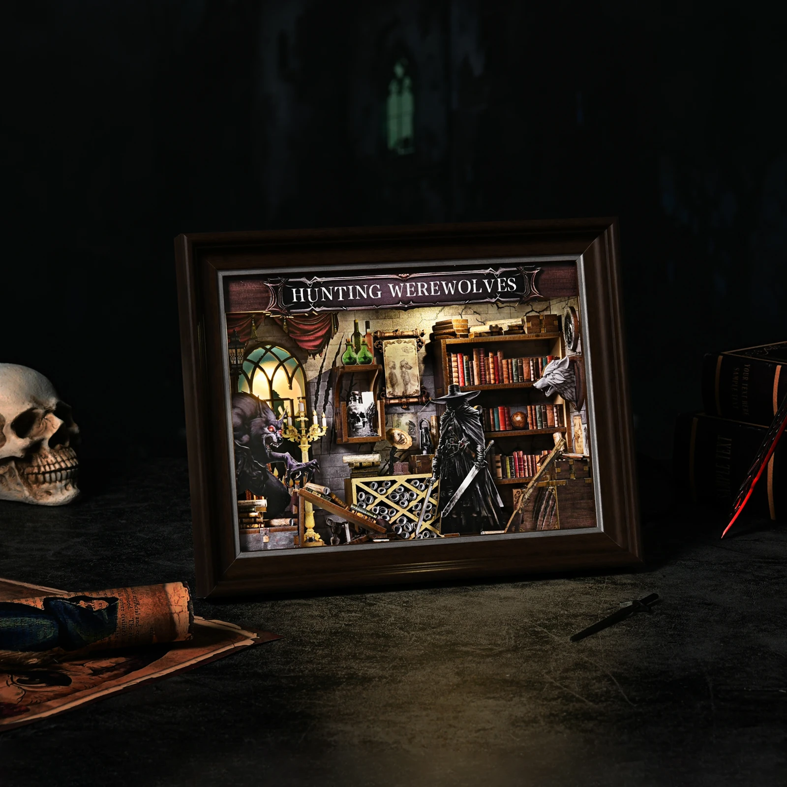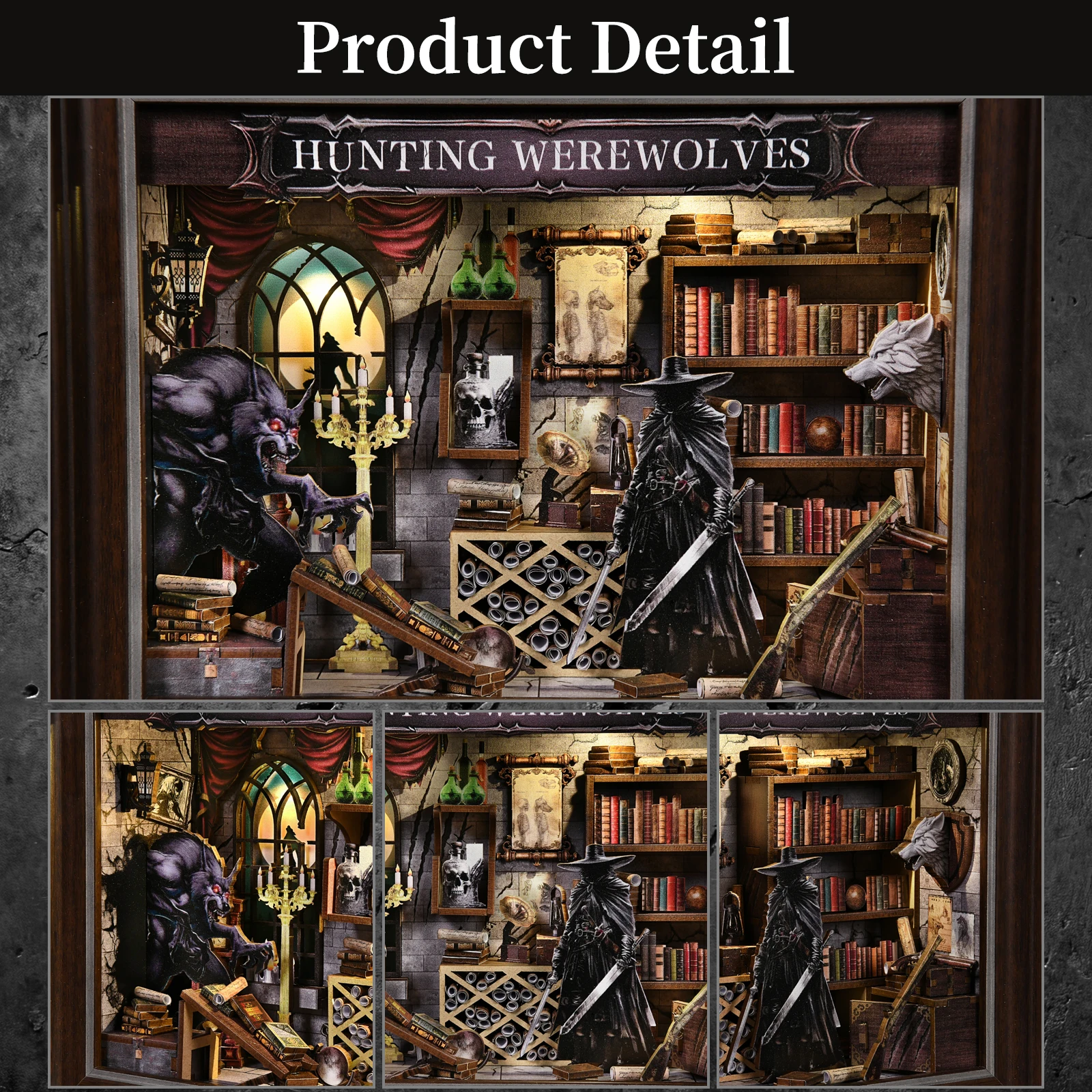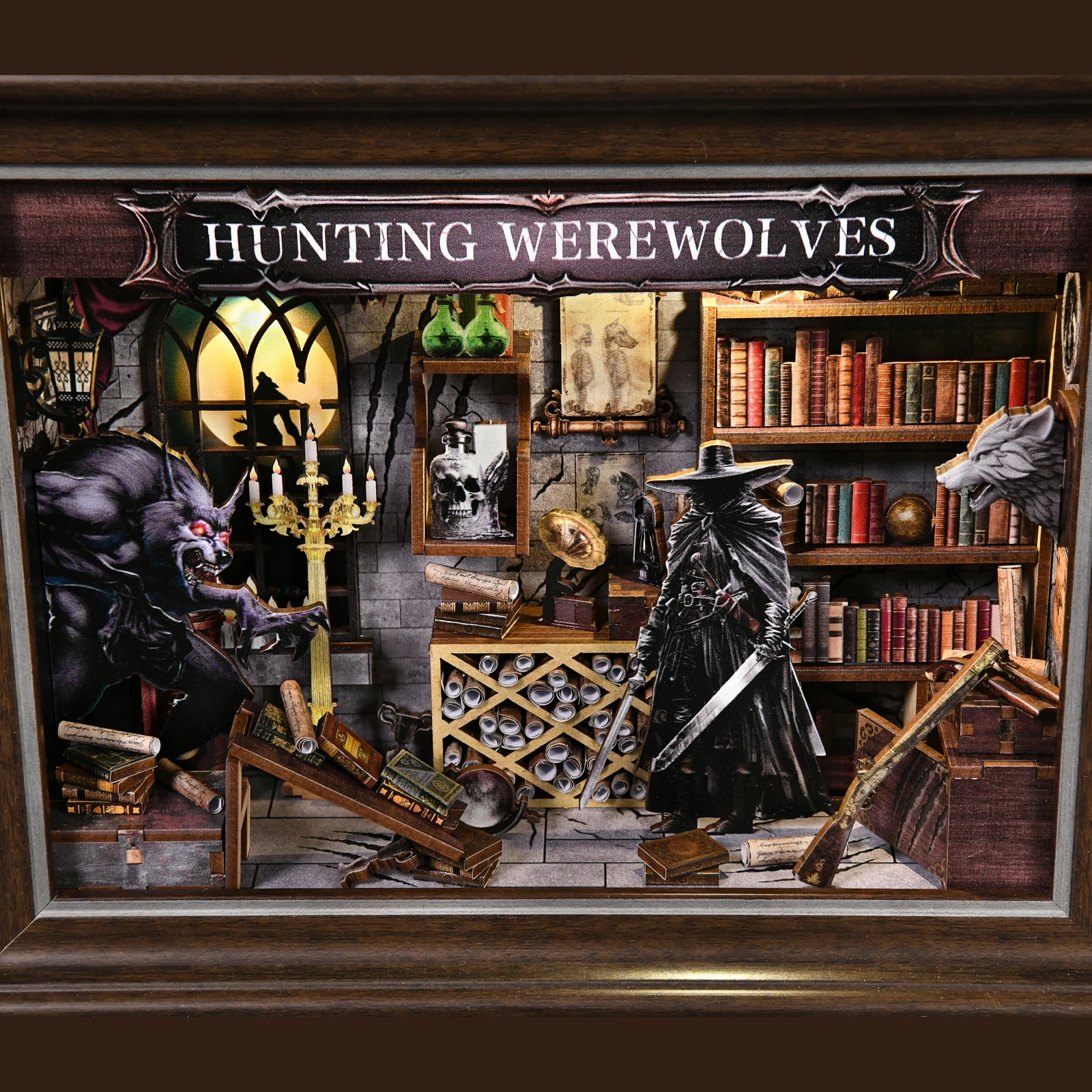 - > Diy livro nook kit lobisomem foto em miniatura casa de bonecas de madeira com luz estante inserção 3d puzzle decoração para presente coruja livraria