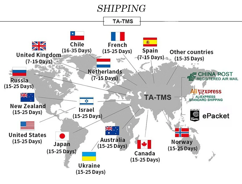 3.Items are shipped by AliExpress Standard Shipping ,AliExpress Premium Shipping,ePacket,reach most of countries within 10 to 30 bussiness days. Delivery time depends on destination and other factors,it may take up to 60 business days.