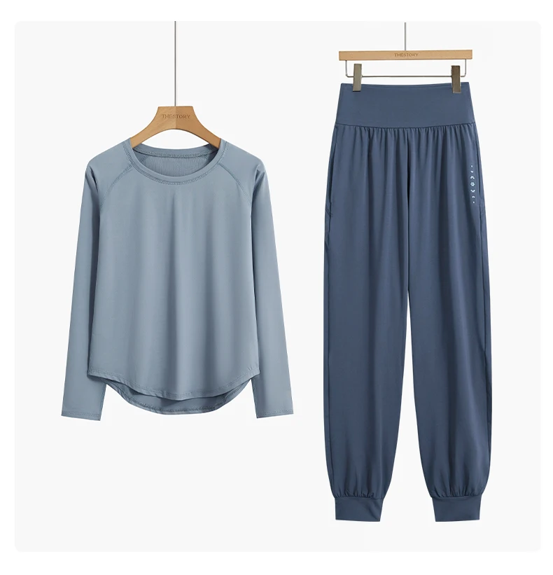 1.Conjuntos de treino lounge de 2 peças: blusas de manga comprida com gola redonda, calças largas de cintura alta na altura do tornozelo com bolsos, roupas esportivas fofas e soltas
