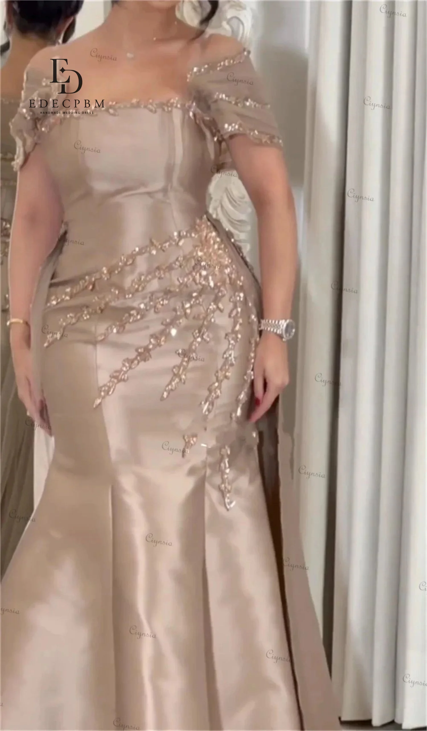 EDECPBM Vestidos de noite femininos sauditas personalizados para ocasiões especiais Vestidos de baile de cetim champanhe 2025 contas festa luxuosa