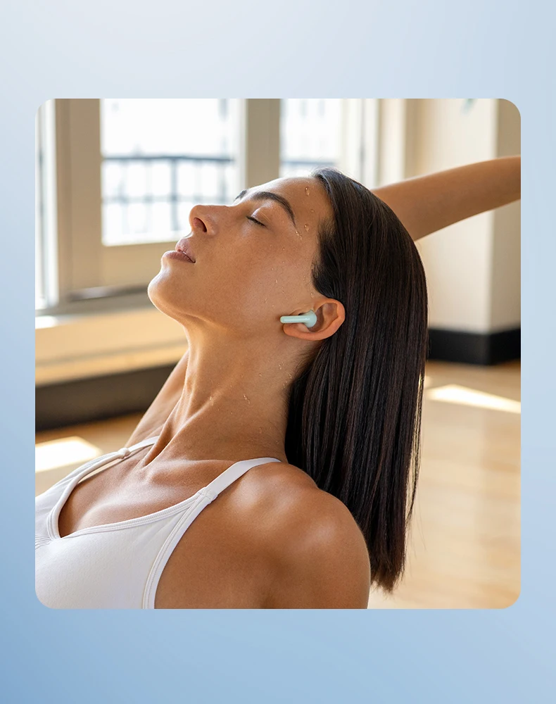 O design ergonômico semi-intra-auricular garante um ajuste confortável, reduzindo a pressão no canal auditivo para conforto duradouro.