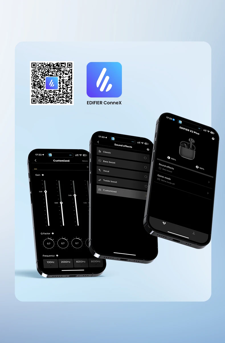 * Experimente EQs predefinidos e personalize seus estilos de audição por meio do aplicativo EDIFIER ConneX.