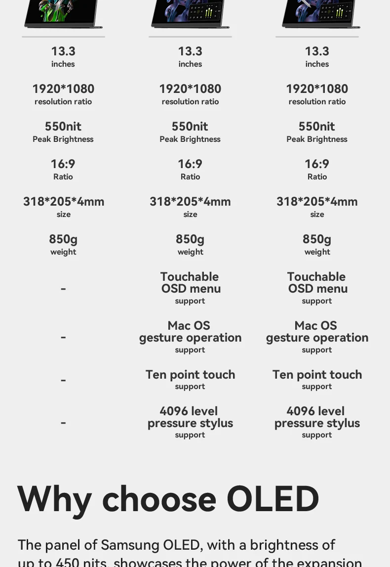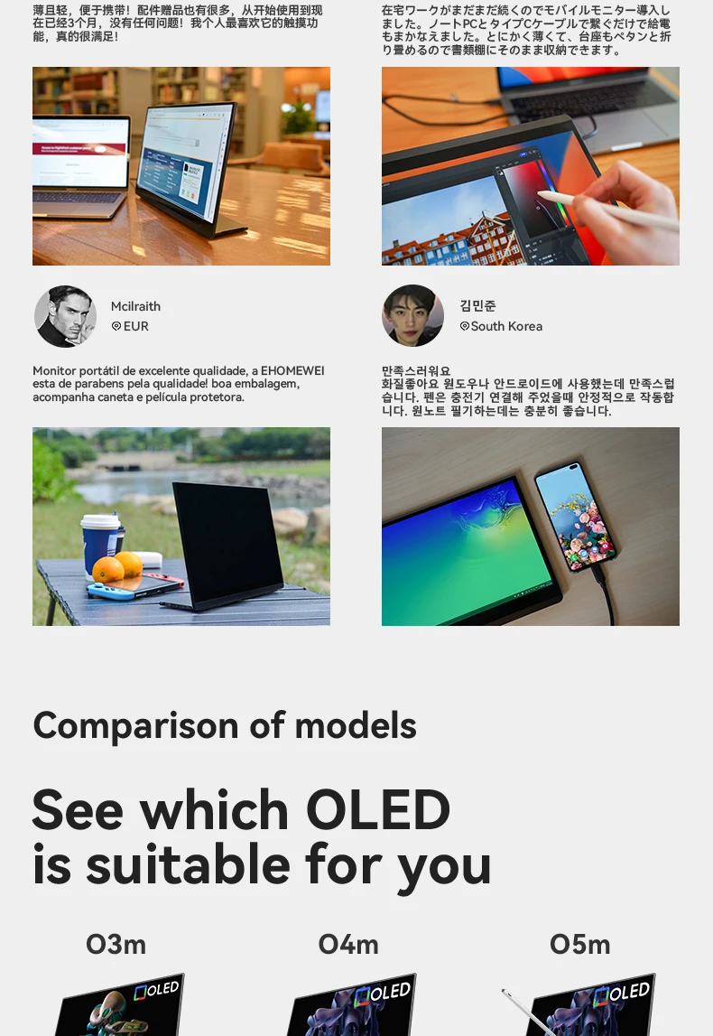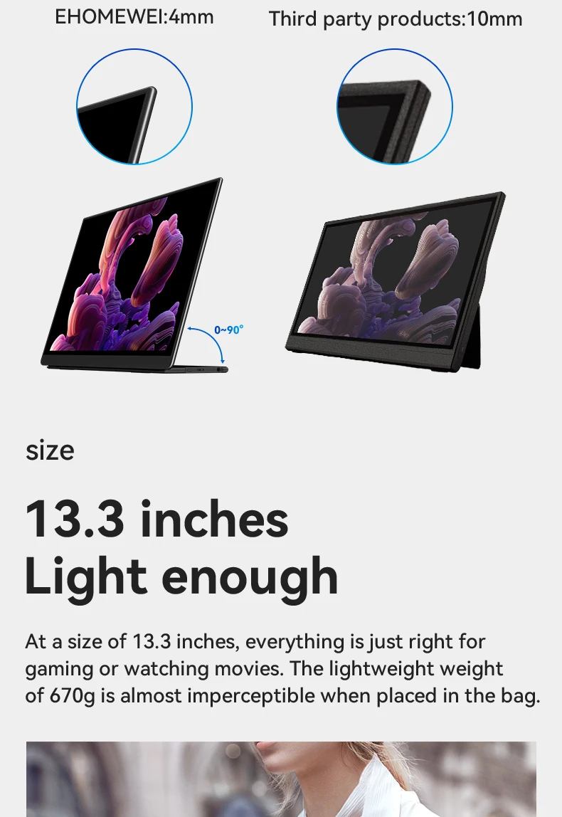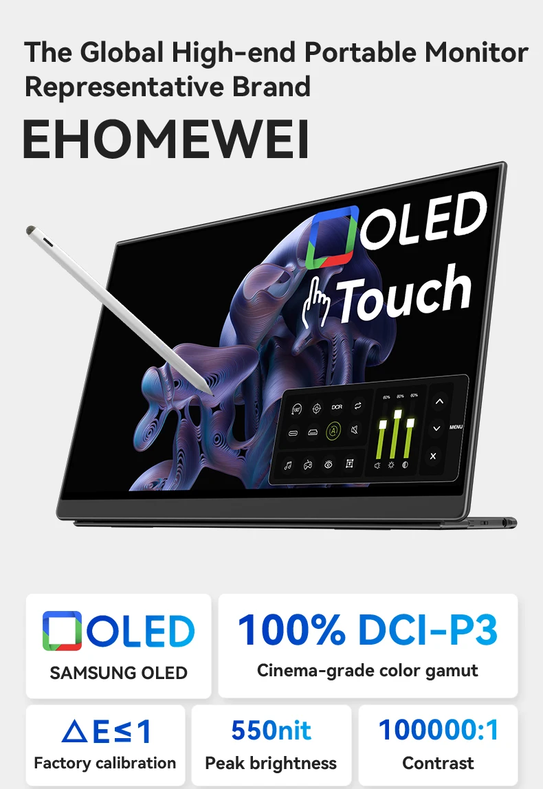 - > EHOMEWEI-OLED Monitor portátil para interruptor laptop Windows Macbook, série Om, 13,3 ", FHD, 60Hz, 100% DCI-P3 16:9