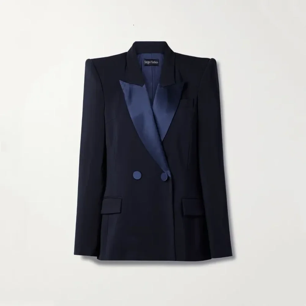 Elegante cetim pico lapela calças femininas define azul marinho moda festa de casamento smoking casual escritório senhora terno 2 peça (jaqueta + calças)