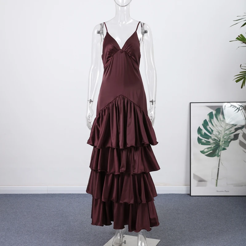 Elegante sólido babados estilingue vestido para mulheres moda sem mangas sem costas festa maxi vestidos 2025 novo feminino férias robes rua