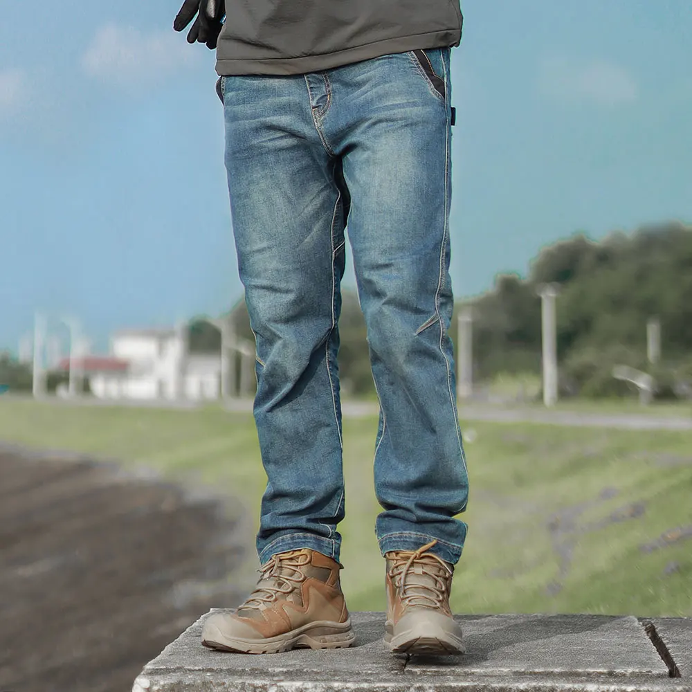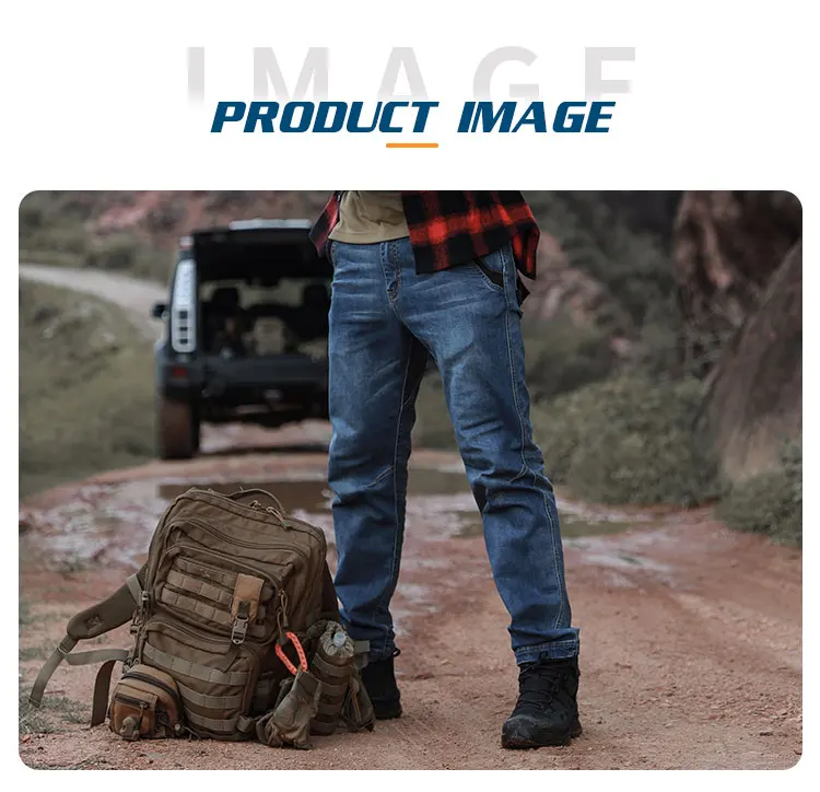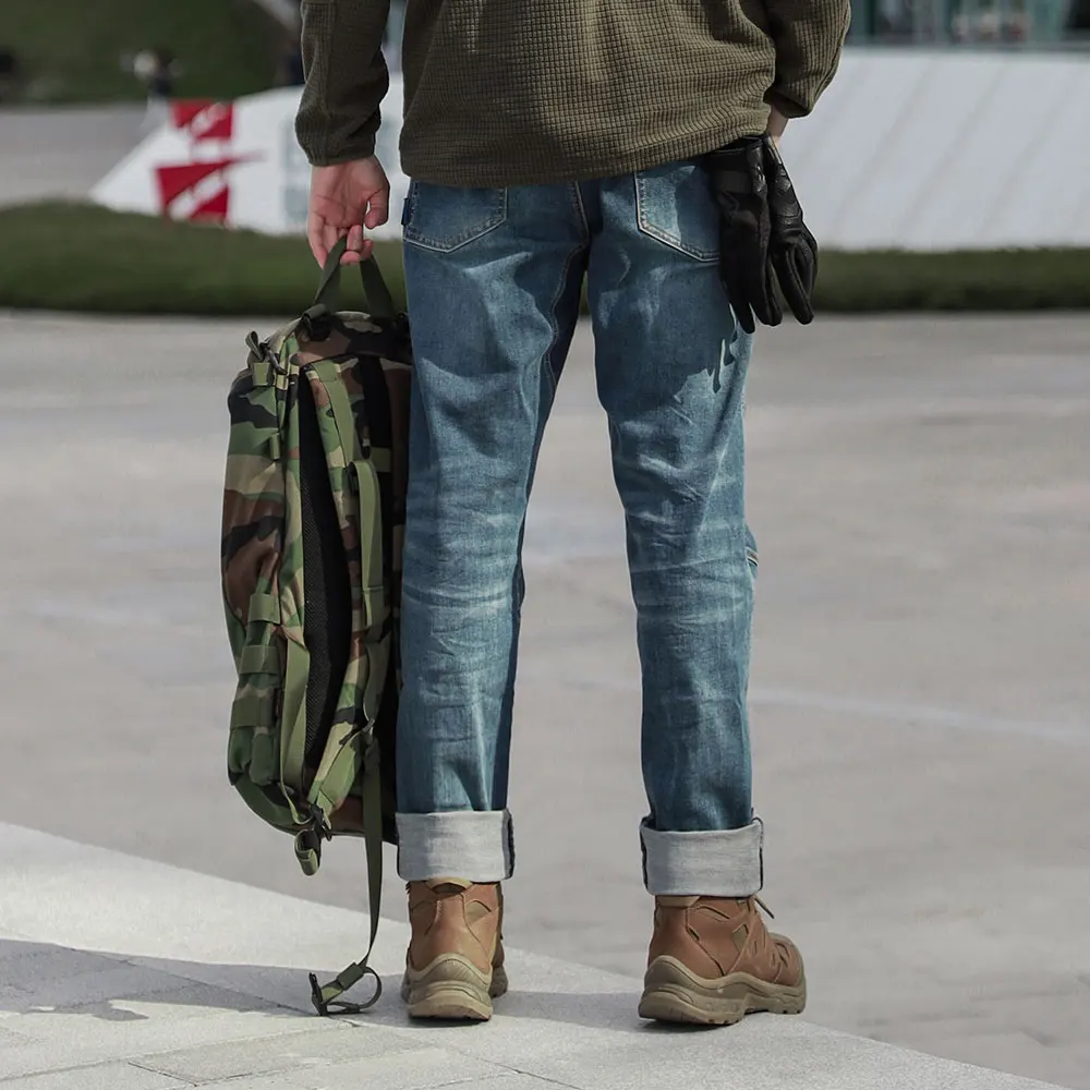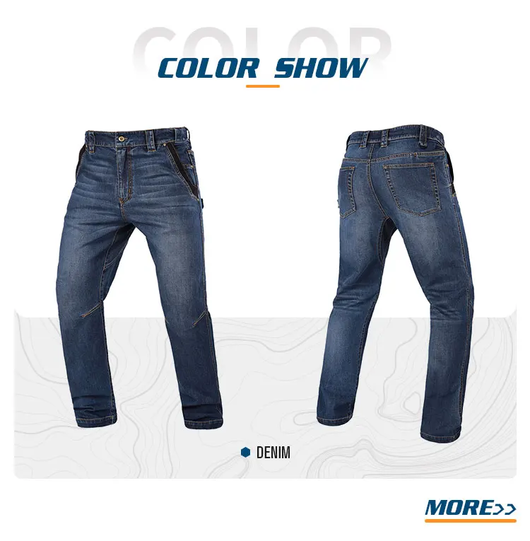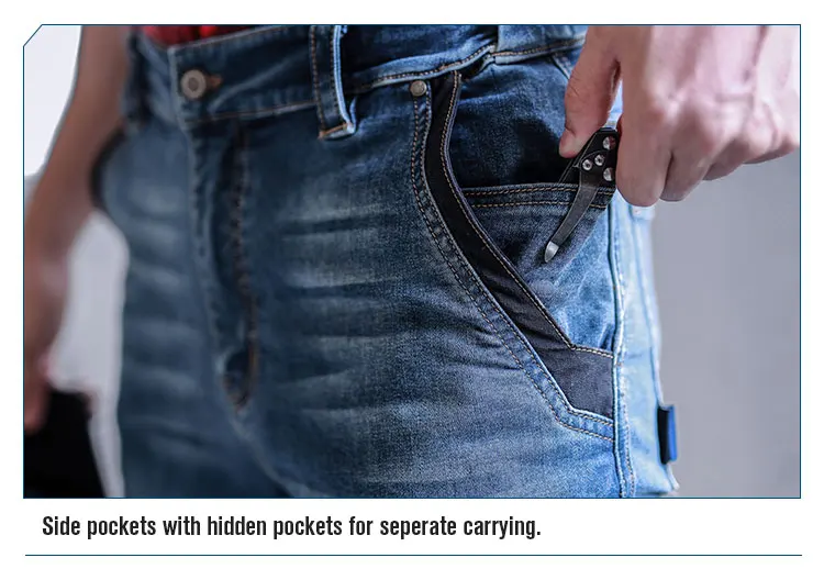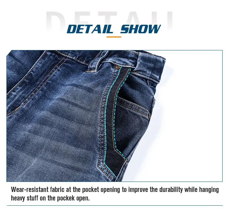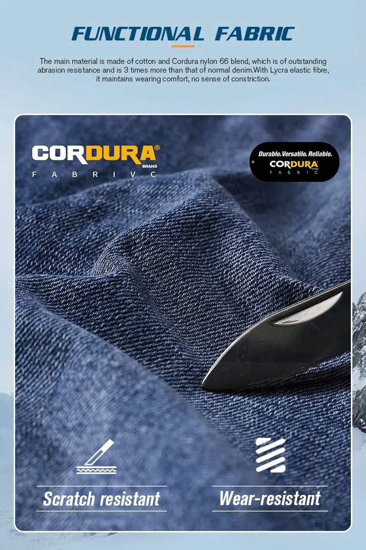 1.Functional fabric: the main material is made of cotton and Cordura nylon 66 blend, which is of outstanding abrasion resistance and is 3 times more than that of normal denim. With Lycra elastic fibre, it maintains wearing comfort, no sense of constriction.