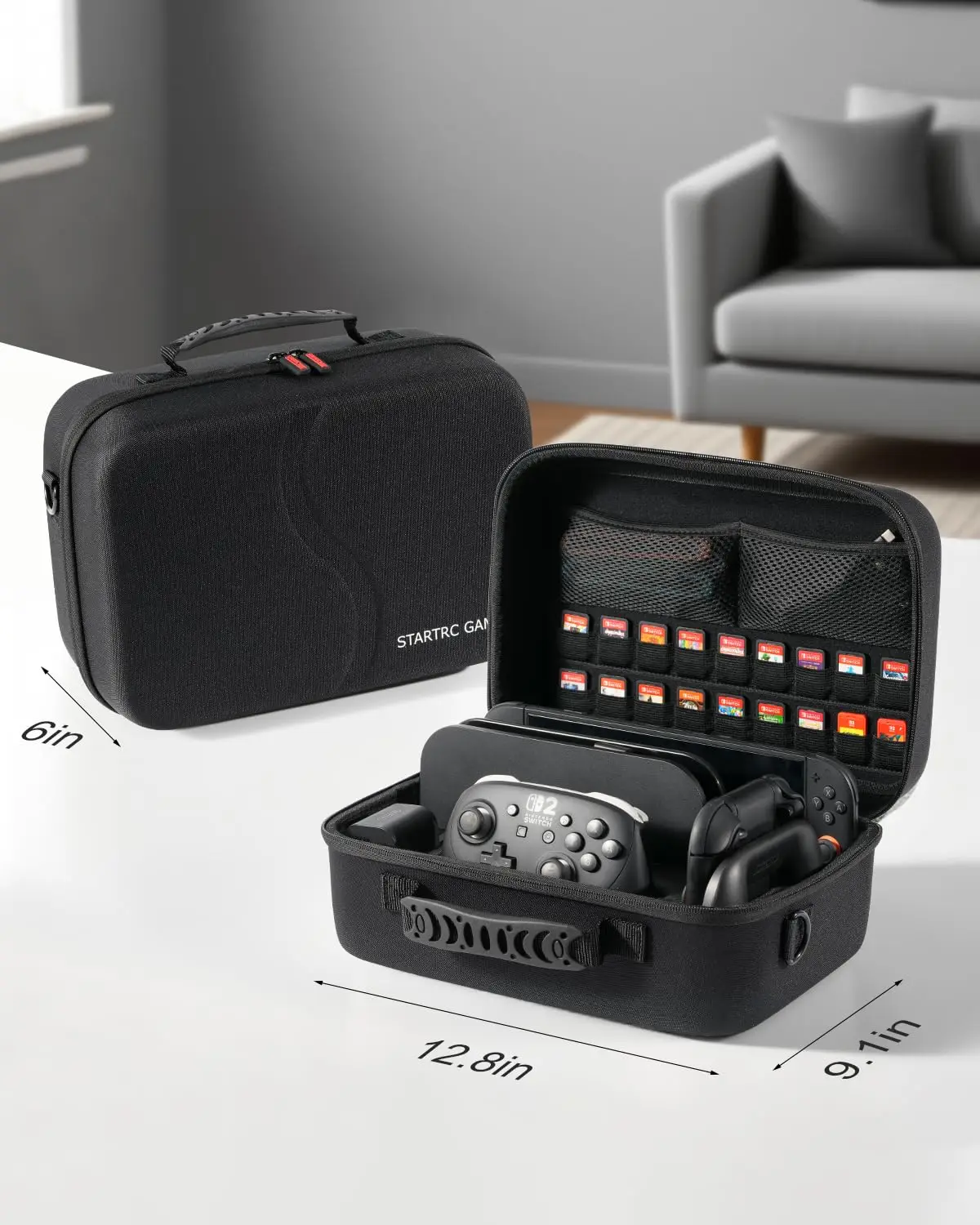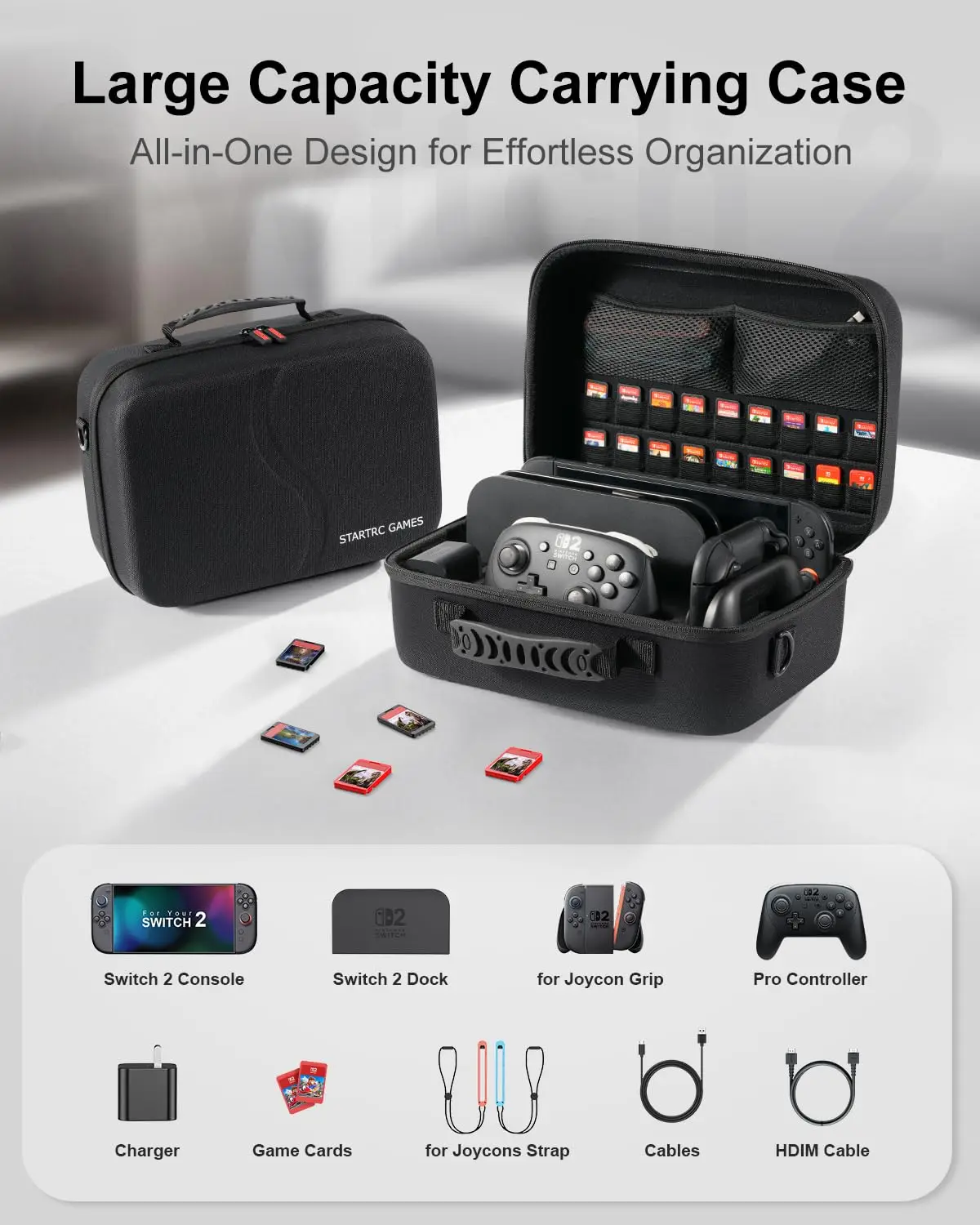 Estojo de Transporte Completo: O estojo de transporte STARTRC GAMES Switch 2 armazena facilmente os itens essenciais que você precisa, incluindo o console Switch 2, o controle Pro, a dock Switch 2, o adaptador de carregador, 18 cartões de jogo, cabos e outros acessórios.